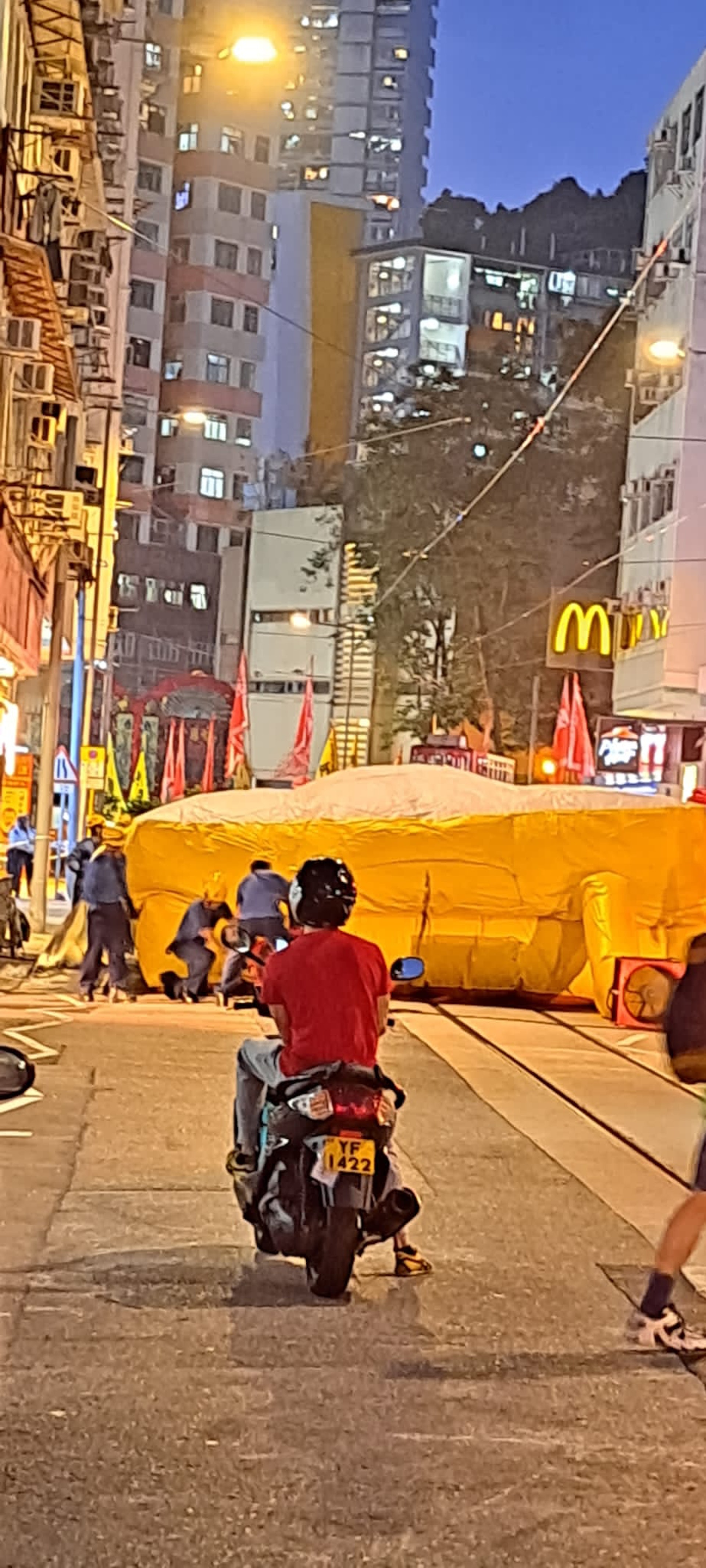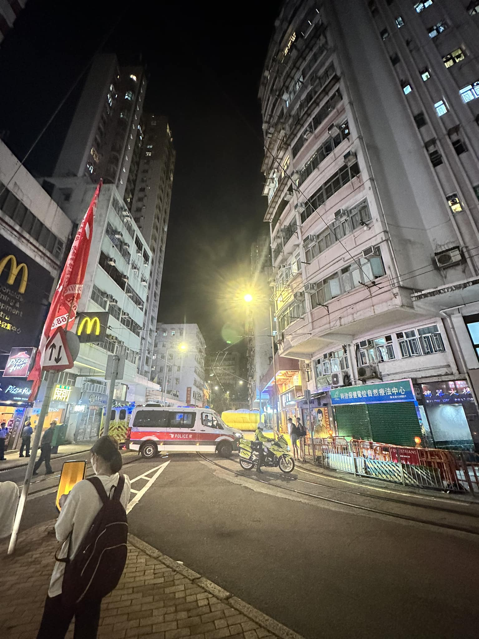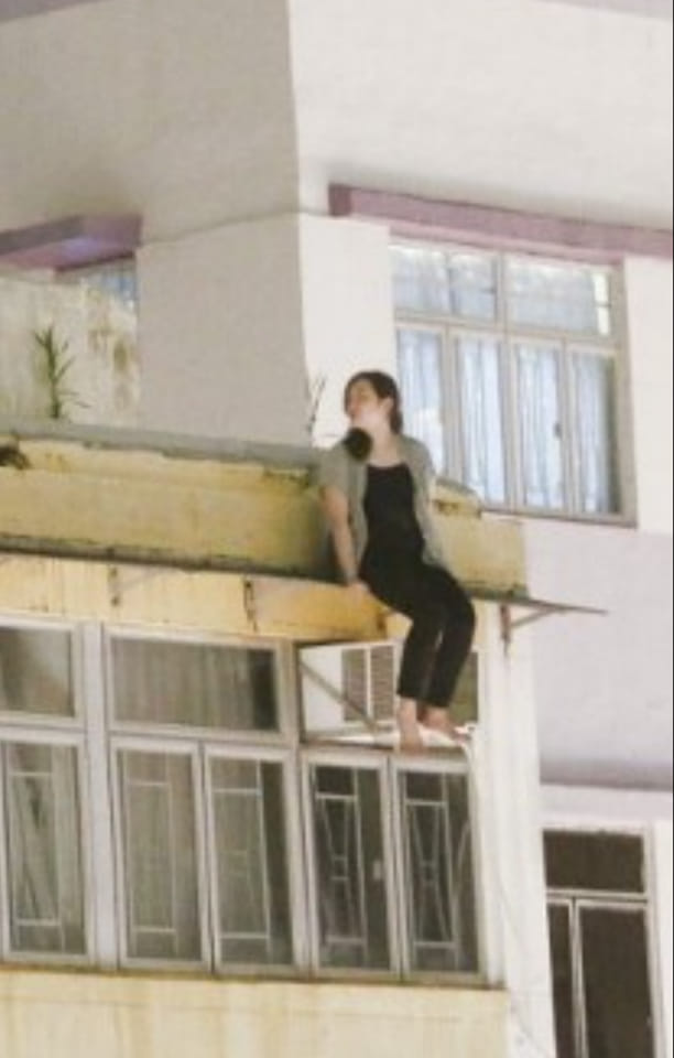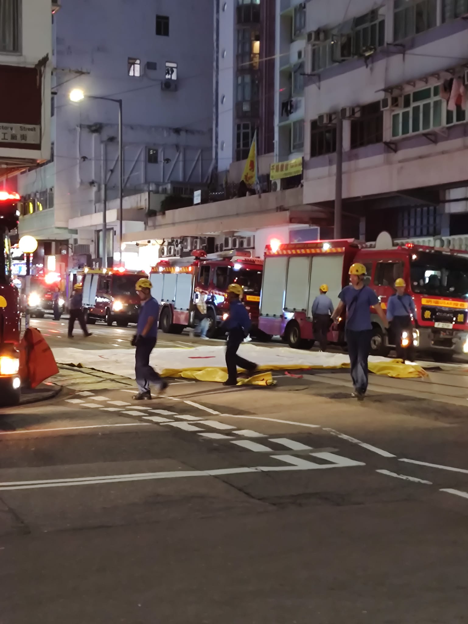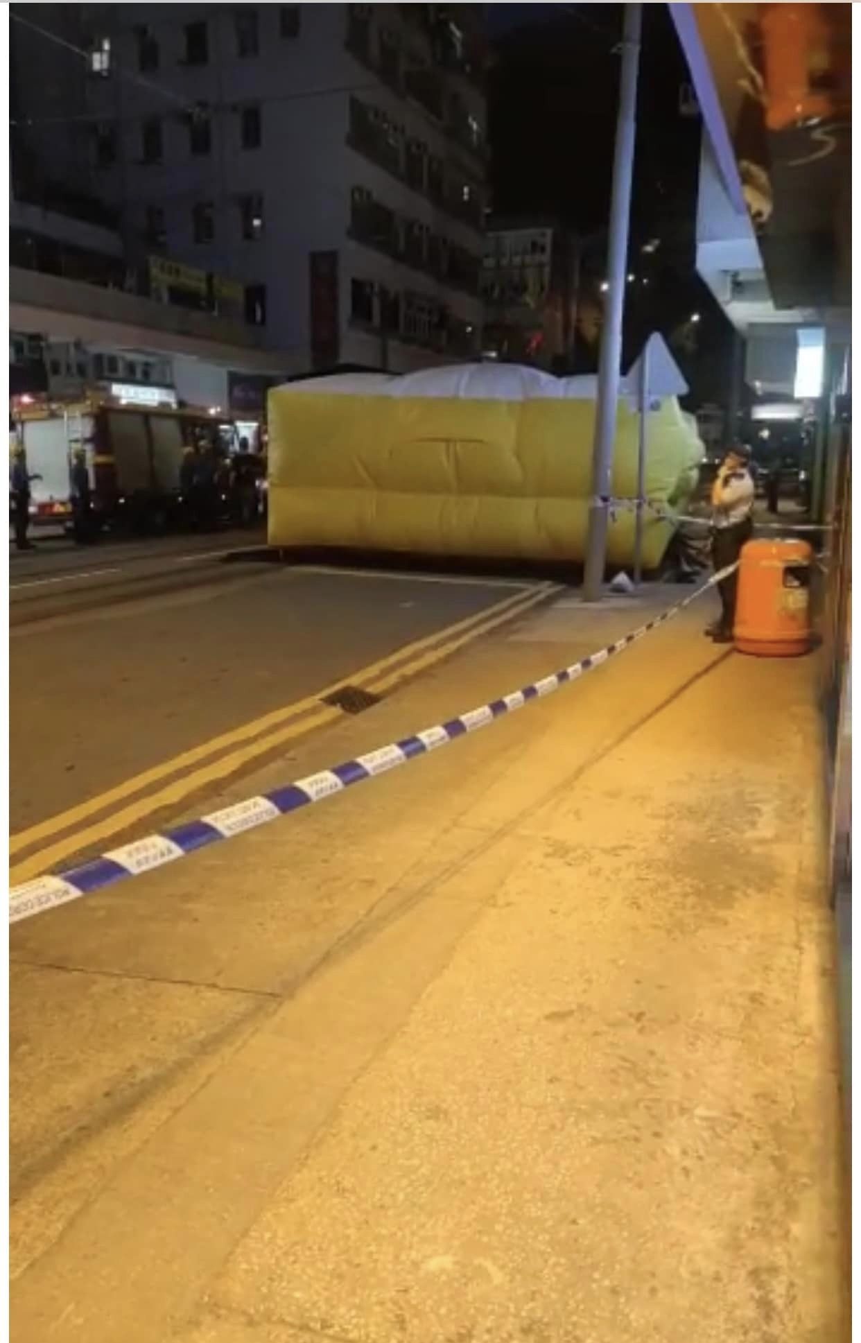 消防接報到場張開救生氣墊戒備,警方派員到場進行游說。(網絡圖片) 一名年約30歲的女子於筲箕灣東大街仿文樓的天台簷篷危坐。(網絡圖片) 消防氣墊封路。(網絡圖片) 消防接報到場張開救生氣墊戒備。(網絡圖片)