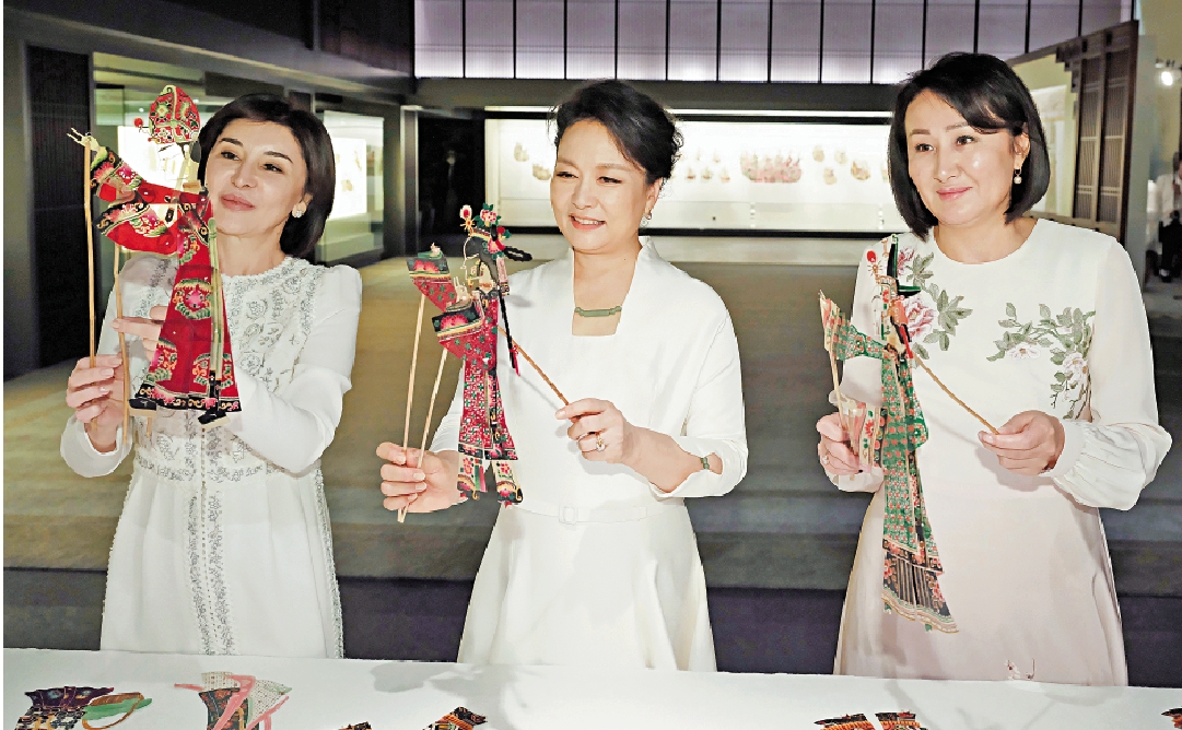 5月19日上午,國家主席習近平夫人彭麗媛邀請出席中國─中亞峰會的吉爾吉斯斯坦總統夫人扎帕羅娃、烏茲別克斯坦總統夫人米爾濟約耶娃共同參觀西安易俗社。在展示廳,彭麗媛同來賓們體驗皮影製作技藝,她們被皮影人物所吸引,興致勃勃地為皮影人物上色點彩。 新華社