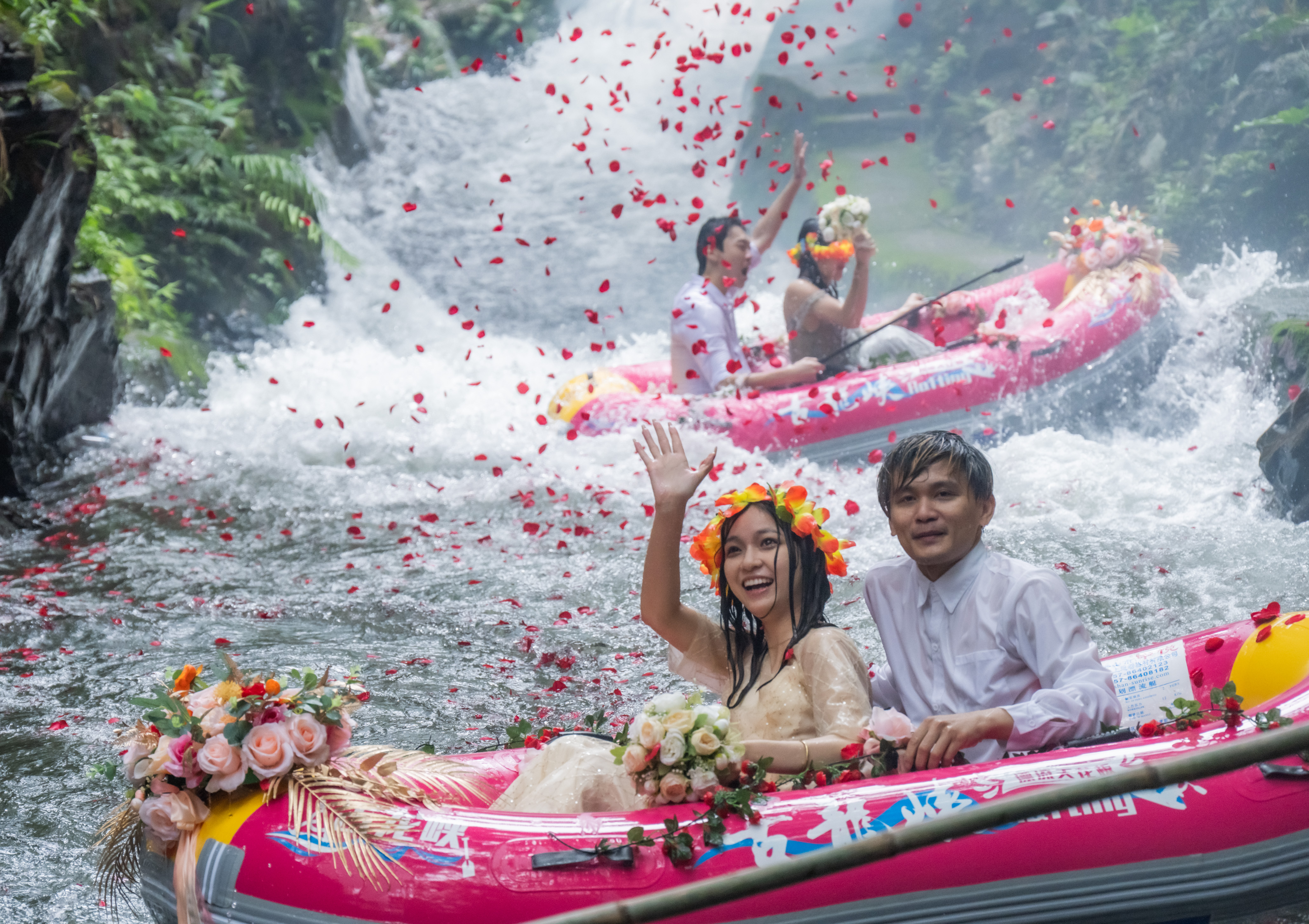 多對新人在近100對情侶見證下,現場進行了「漂流婚禮」。被花束和花球環繞的粉紅色漂流艇,成為了漂流河道裏的「婚車」,一路急速前行。尤其是在古龍峽「神龍擺尾」河段,落差達17米,相當於6層樓的垂直高度,轉角達180度,類似「U型」大轉彎。一時之間,歡呼聲與尖叫聲在峽谷間延綿流轉。清遠市民黃先生攜新婚妻子參加了此次活動。他說:「這次穿着禮服來漂流,真的讓人很難忘。」