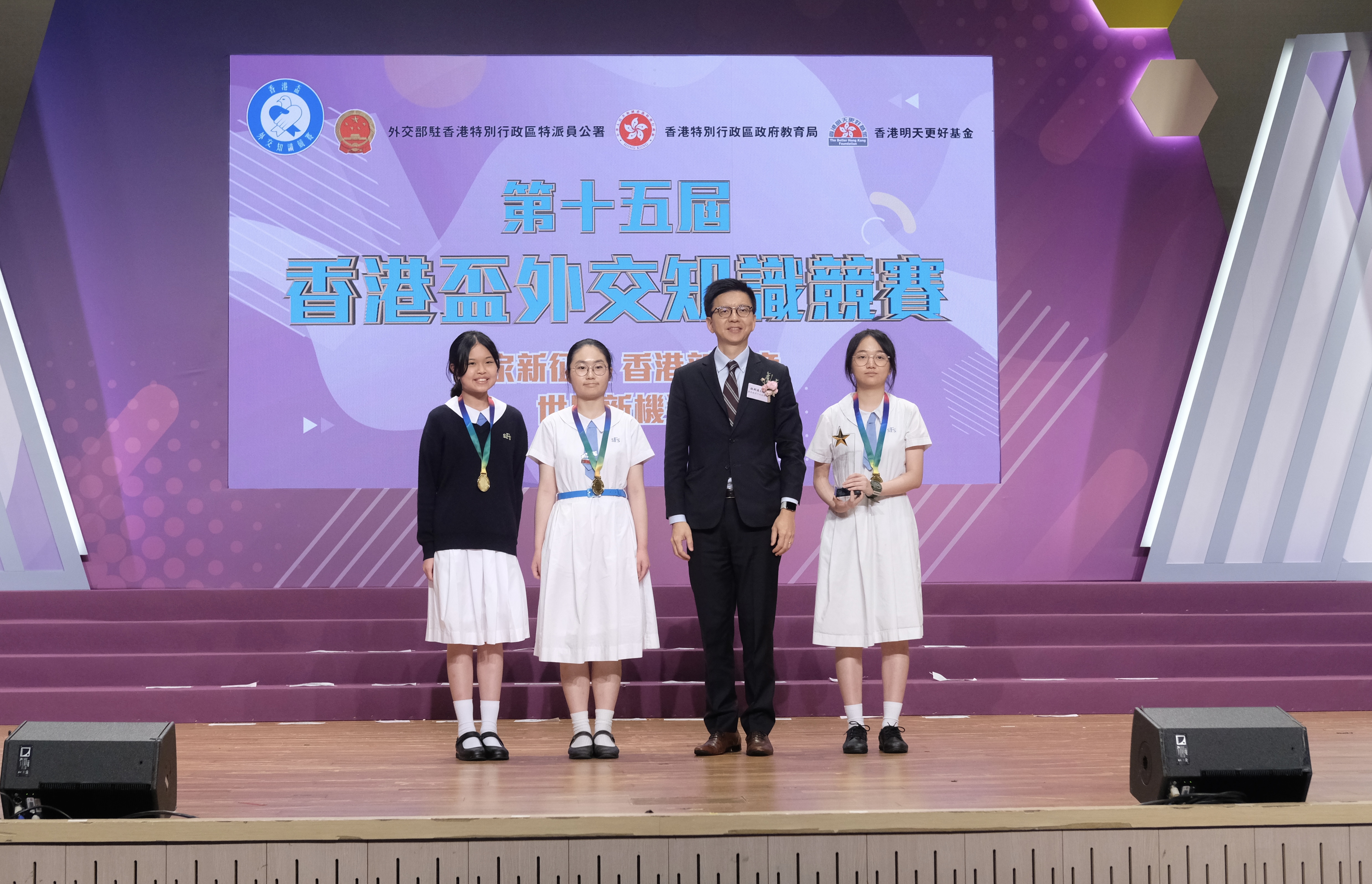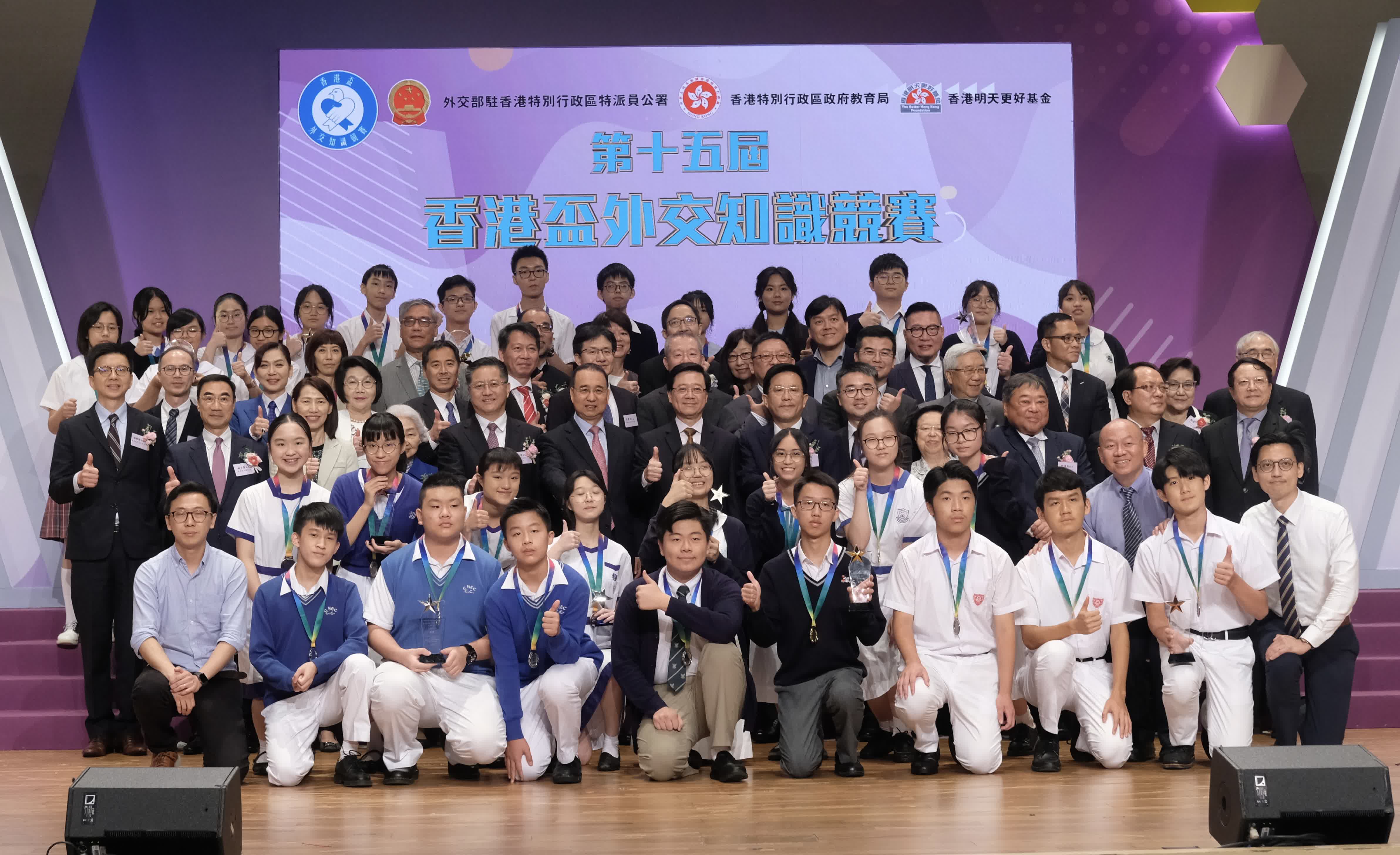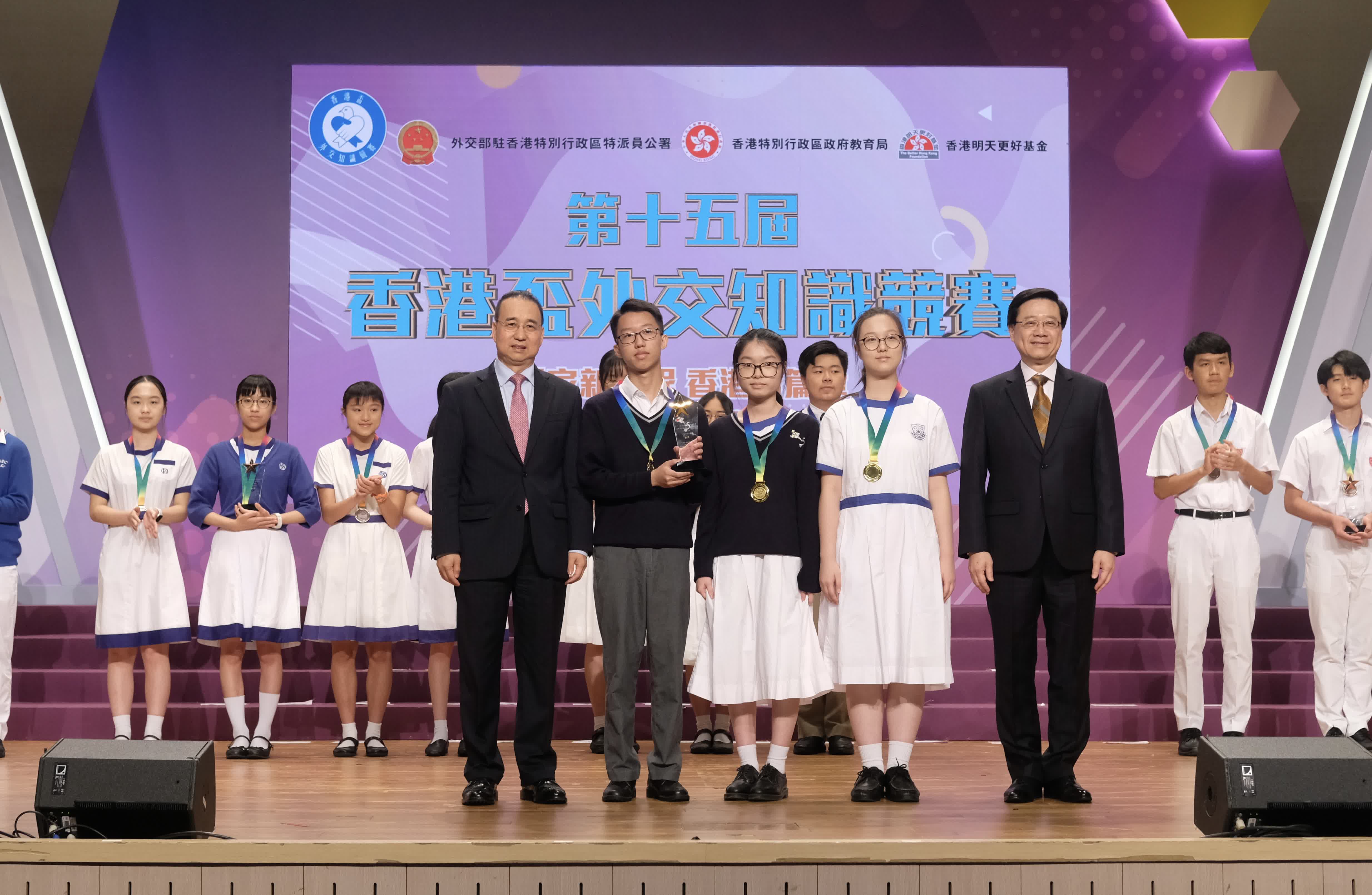 (大公文匯網 記者 廖敏烔)第十五屆「香港盃」外交知識競賽決賽暨頒獎典禮20日在保良局蔡繼有學校成功舉辦。香港特區行政長官李家超、外交部駐港公署特派員劉光源、中央政府駐港聯絡辦秘書長王松苗、駐港國安公署副署長李江舟等主禮嘉賓出席頒獎典禮。