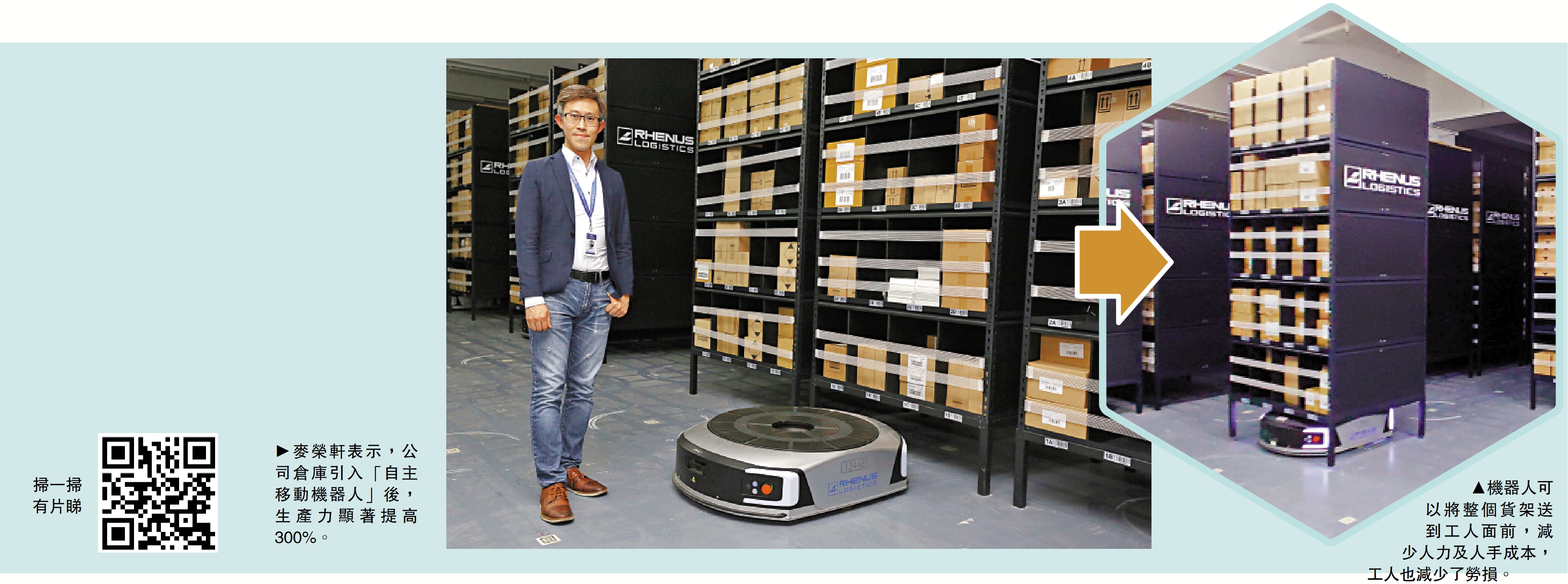 物流供應商「雷諾斯香港」(Rhenus Logistics Hong Kong)於2002年成立,提供空運、海運和陸運服務,目前在本港設有一個辦公室及兩個倉庫。為配合數碼化發展,早前申請政府的「第三方物流服務供應商資助先導計劃」,獲得100萬元資助,再自行斥資300萬元引入10部「自主移動機器人」(AMR)系統,於元朗科技中心的倉庫內應用。