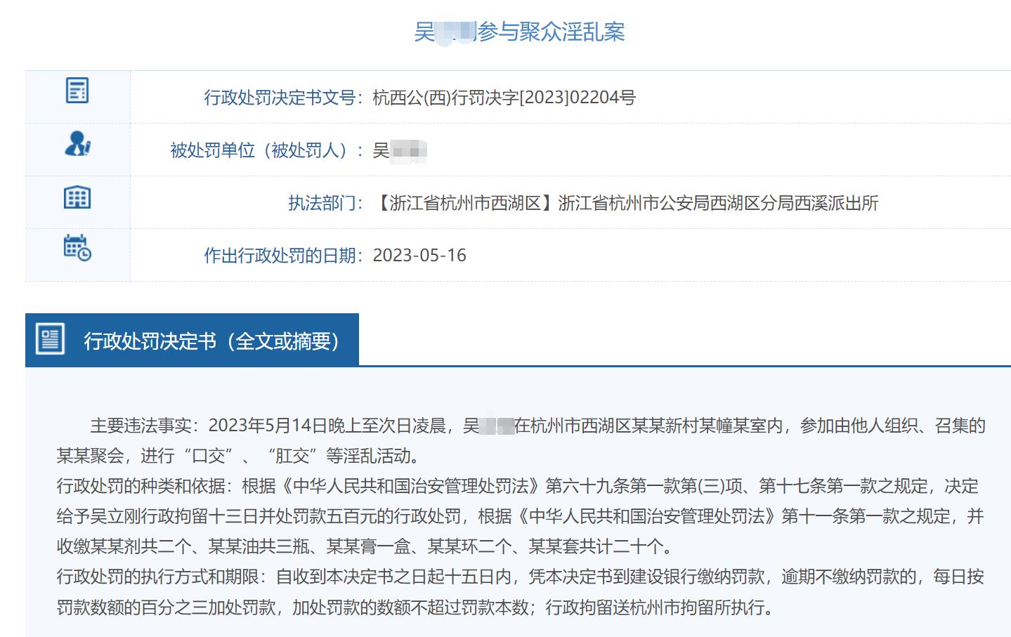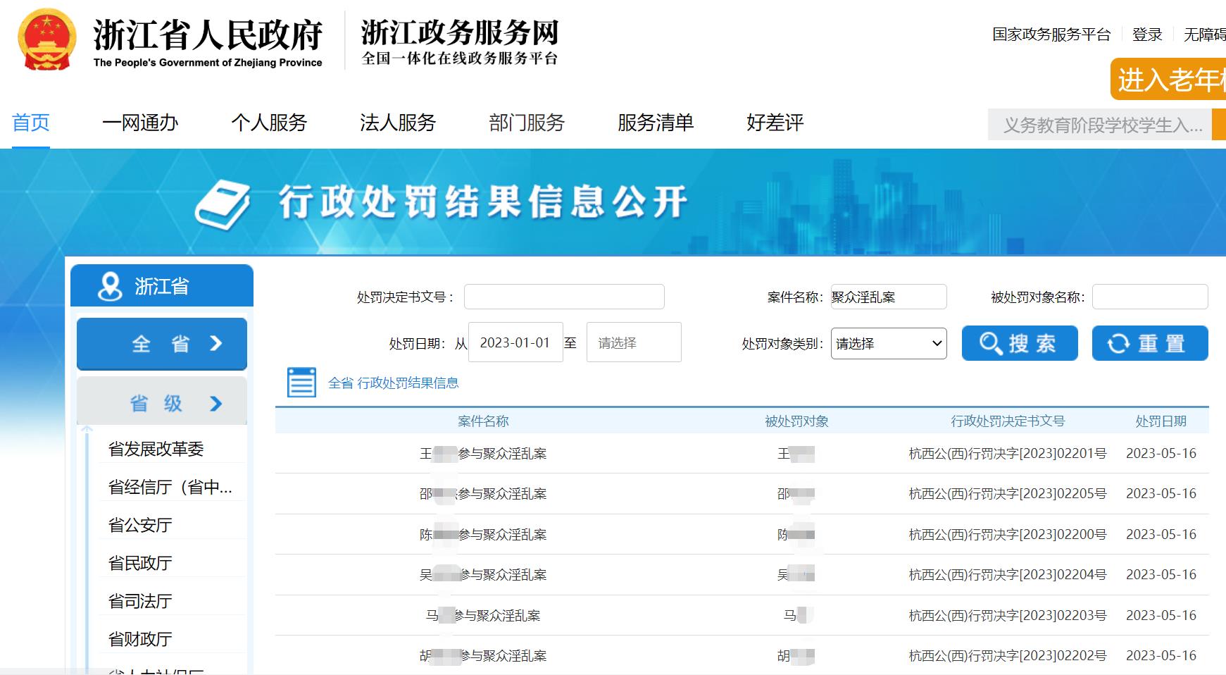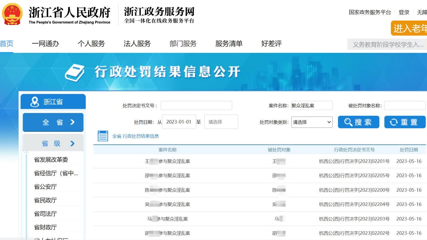 大公文匯全媒體報道:5月16日,杭州市有6人因參與聚眾淫亂被處罰,該行政處罰決定書被公示於浙江政務服務網後,引發網絡關注。在6人共6份行政處罰決定書中,均公示了被處罰人的完整姓名。其中一則行政處罰決定書中寫道,被處罰人參加由他人組織、召集的男同性戀群體聚會,進行淫亂活動,還列出了違法細節以及現場收繳的相關物品清單。