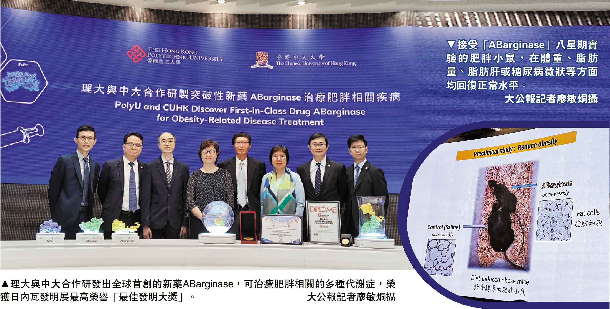 (大公報 記者 廖敏烔)世衞數據顯示,2016年全球逾19億成年人超重,其中逾6.5億人肥胖。而在本港,約兩名成年人中就有一人的體重指標被界定為超重或肥胖。這往往涉及許多慢性疾病,如糖尿病、非酒精性脂肪肝、心臟病、高血壓及癌症等。為了解決這個問題,香港理工大學和香港中文大學合作研發新藥「ABarginase」,可治療多種與肥胖症和胰島素抵抗相關的代謝性疾病。