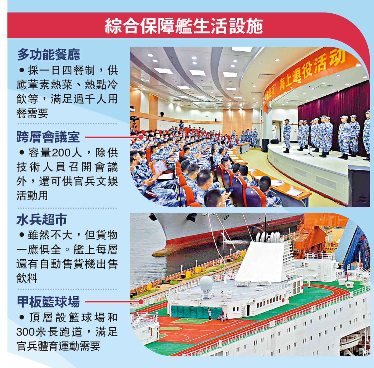 航母綜合保障艦排水量約2.3萬噸,與航空母艦、兩棲攻擊艦、遠洋綜合補給艦、船塢登陸艦等,構成了解放軍噸位最大的巨艦陣容。該型艦全長約196米,最高速度18節,乘員可多達2500人,自給力30天。可搭載1架直-8大型運輸直升機。艦載武器包括2座81式火箭發射器、2座57毫米雙聯艦炮和2座30毫米雙聯艦炮,主要用於低烈度近程防禦。酈道元艦外觀類似大型郵輪。艦上具有設施齊全的生活保障設施,包括宿舍、餐廳、咖啡館、超市、網吧、健身房、籃球場、塑膠跑道等,也安裝了與航母各種設備相對應的模擬器,為官兵提供模擬訓練。