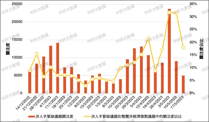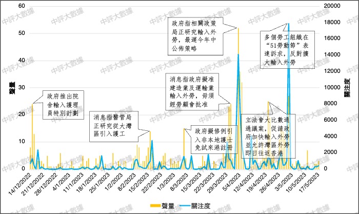 中心分析發現,近幾個月以來,香港社交媒體涉人手緊缺議題的關注度接連迎來幾波高峰,其在整體涉經濟復甦輿情中的關注度佔比也屢次飆高,上述兩個指標更於「五一黃金周」雙雙創下觀察期內的最高峰值。政府正研究把更多行業納入輸入外勞的範圍,除了以往社會討論最多的醫療行業外,建造、運輸業等長期人手不足、青黃不接的行業也成為焦點。社交媒體近月涉該議題的聲量與關注度有較明顯的升溫,其中不少是來自勞工階層群體的反對聲音。