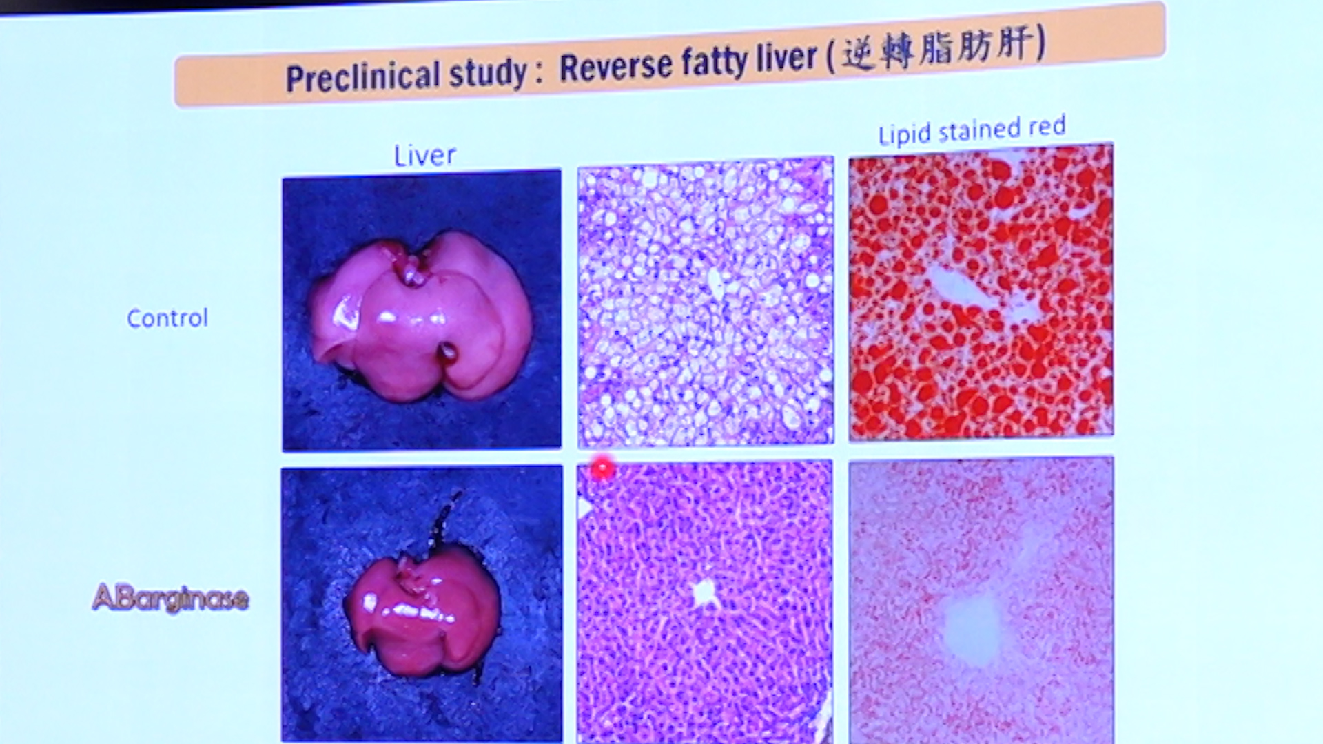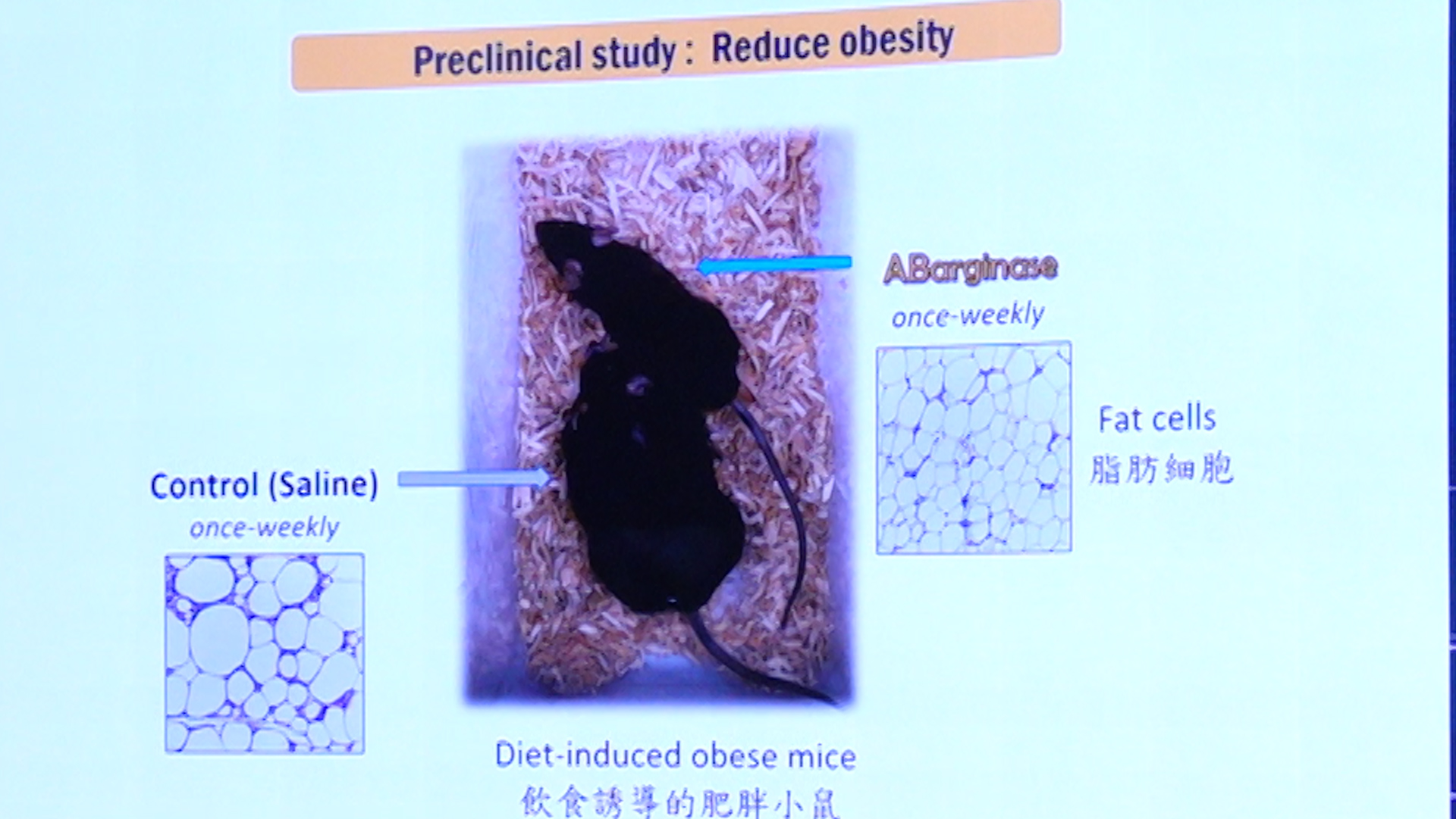 據沈秀媛介紹,對兩組經飲食誘導的肥胖小鼠分別注射「ABarginase」和生理鹽水,每周一次持續八星期後,相較注射鹽水的對照組,「ABarginase」組的小鼠在體重、脂肪量、脂肪肝,或糖尿病症狀如高血糖、胰島素抵抗和葡萄糖耐受不良等方面均回復正常水平。並且,在結束一個為期八周的療程停藥後,「ABarginase」組的小鼠在未進食高脂肪食物前提下,各項指標均維持正常。她指出,相信患者在完成八星期療程後,只要減少食用高脂肪食物,即可無反彈,「即醫好相關代謝病。」