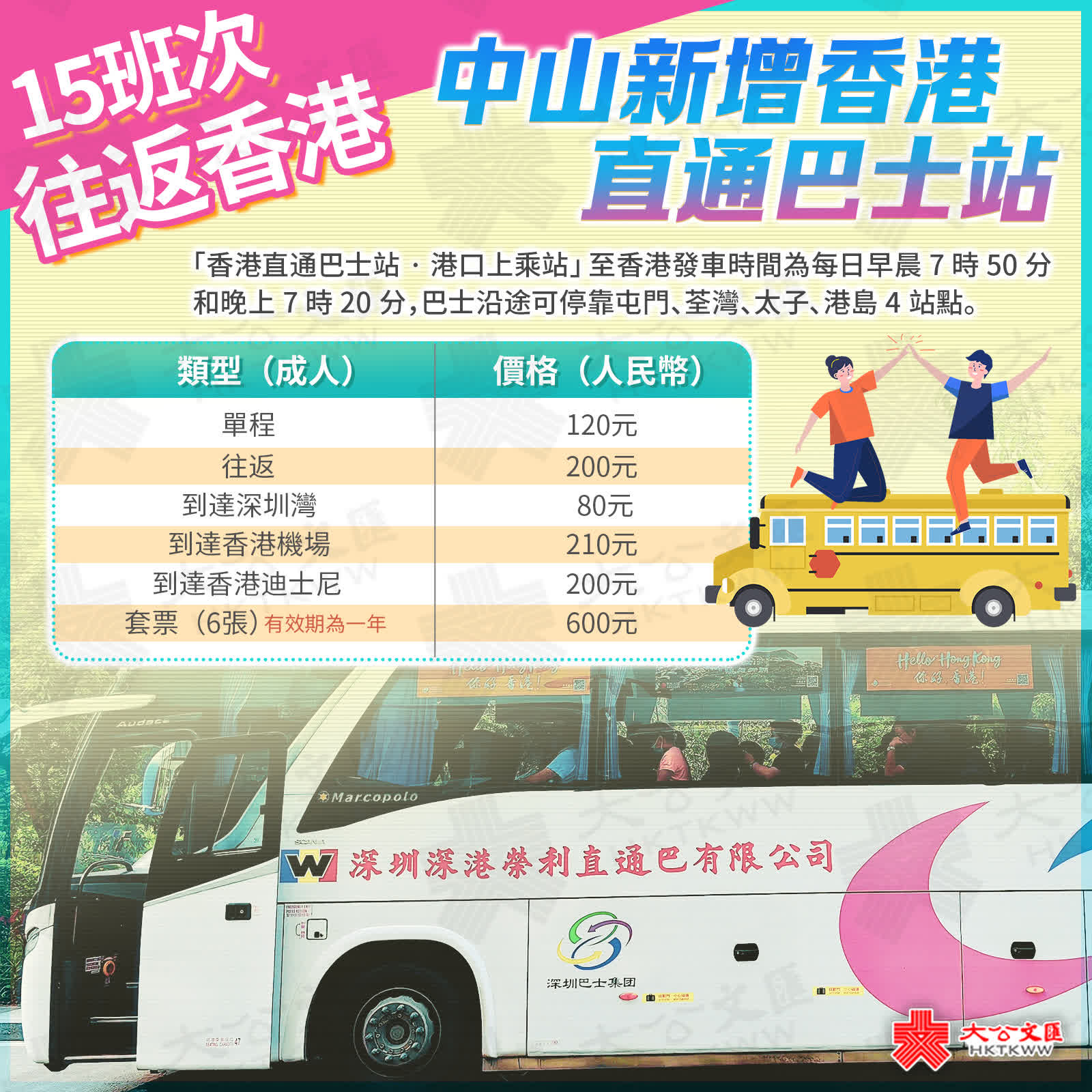 據了解,目前「香港直通巴士站·港口上乘站」至香港發車時間為每日早晨7時50分和晚上7時20分,巴士沿途可停靠屯門、荃灣、太子、港島4站點。成人單程票價為120元(人民幣,下同)、來回票價為200元;到深圳灣的票價為80元;到香港機場的票價為210元;到香港迪士尼的票價為200元。套票(6張)票價為600元,有效期為一年。