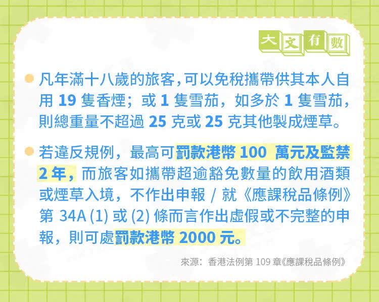 法例規定攜帶19隻以上煙草入境需繳稅,若正常進行海關申報,只需繳稅約954.78港幣。若拒絕支付罰款則可判坐牢,若不想被檢控,則需立即繳付有關稅款的5倍。