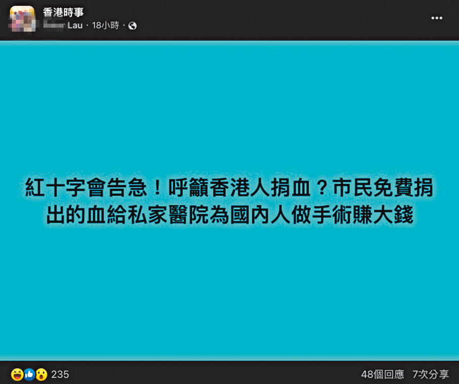 造謠火頭近日更燒向香港紅十字會的血庫,訛稱「血是給內地醫院賺大錢用」,煽動網民不要捐血。