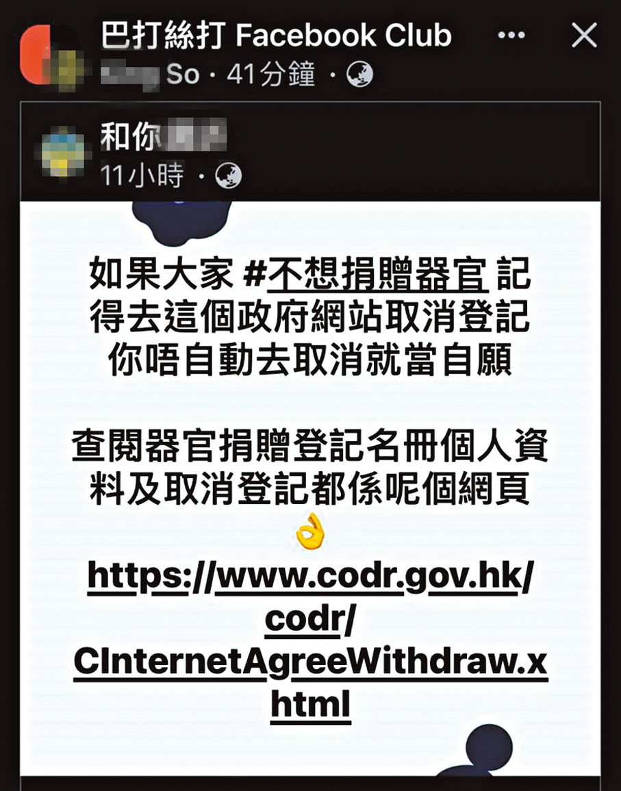 (香港文匯報記者 文禮願)經歷黑暴及新冠疫情洗禮,香港踏上復常路,但惡勢力的軟對抗仍蠢蠢欲動,反中亂港分子近日借香港與內地探討建立恒常器官移植互助機制,造謠稱「全民被自動納入器官捐贈名冊」,煽動網民不論之前有無登記捐贈器官,一律要申請取消捐贈,否則「器官會捐到內地」云云。香港特區政府衞生署昨日表示,最近5個月共有5,785宗取消登記的申請,當中逾半人之前根本從未登記,不排除有人意圖擾亂中央名冊及增加政府人員的行政負擔。香港文匯報更發現,血庫成下個目標,有人煽動網民停止捐血。立法會議員批評,造謠者製造兩地矛盾,亦令急需器官及血液捐贈的人士錯失配對機會,行為「非常冷血」,促請特區政府盡快立法管制「假新聞」,以及徹查散播假消息者有否違犯香港國安法。