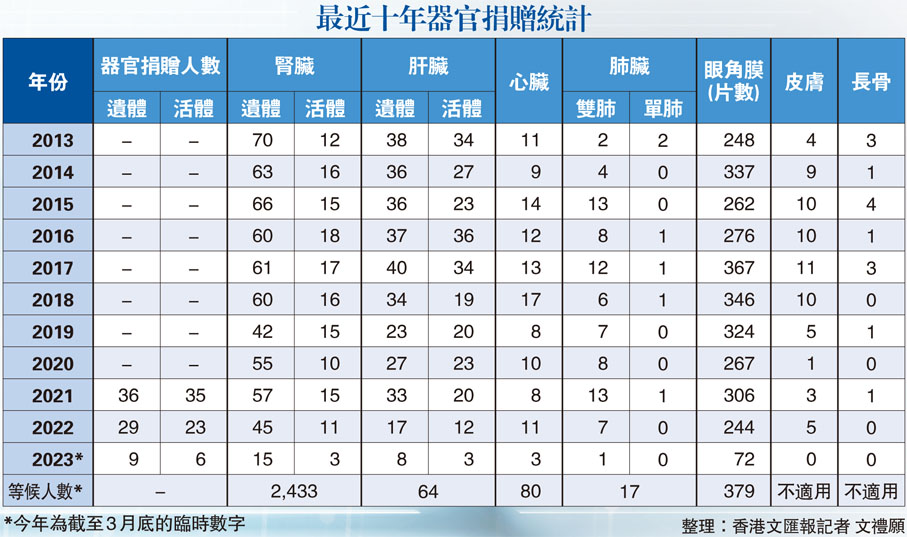 香港的遺體器官捐贈一直採用「自願捐贈」模式,中央名冊自2008年設立以來,登記人數一直持續增長,由2009年的45,150人增至現時超過35.7萬人,反映器官捐贈受廣大市民支持。政府呼籲市民繼續支持器官捐贈挽救生命的大愛行為,不要為少數別有用心的人挑動而破壞本港多年建立、得來不易的器官捐贈氛圍。
