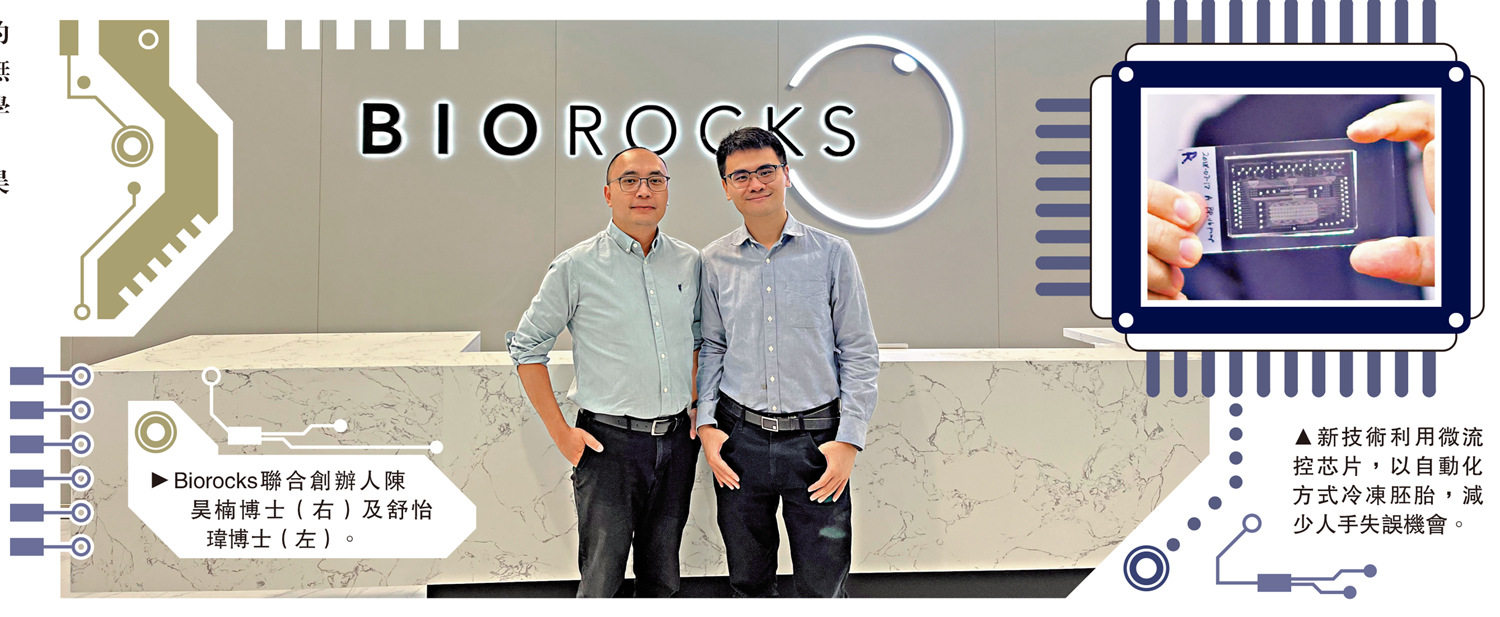 據了解,冷凍胚胎不可直接冷凍。玻璃化冷凍的方式是利用濃度更高的冷凍保護劑令胚胎脫水,再把胚胎置入冷凍載體,最後放入液氮環境中。如果這個過程以全人工操作,需要八個複雜的步驟,成功率僅為80%至90%。但利用微流控芯片技術,成功率可以提升到99.5%。