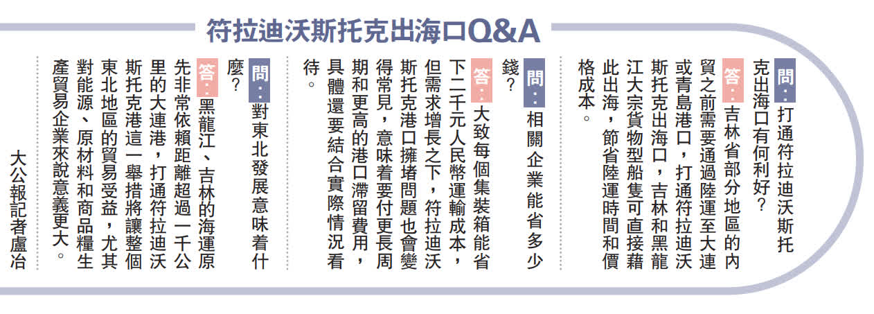 (大公報 記者 盧冶、焦紅瑞、于海江、吳千))日前,中國海關總署同意吉林省進一步擴大內貿貨物跨境運輸業務,增加俄羅斯符拉迪沃斯托克(海參崴)港作為內貿貨物中轉口岸,並於今年6月1日起實施。對此,國務院發展研究中心歐亞社會發展研究所所長李永全表示,「增加符拉迪沃斯托克為中國內貿貨物跨境運輸的中轉港口,將有助於中方節約海運成本,提高海運業務效率,加強中方和該港口的海運合作,將使該港口在中俄以及亞太地區海運業務中發揮更大作用。」