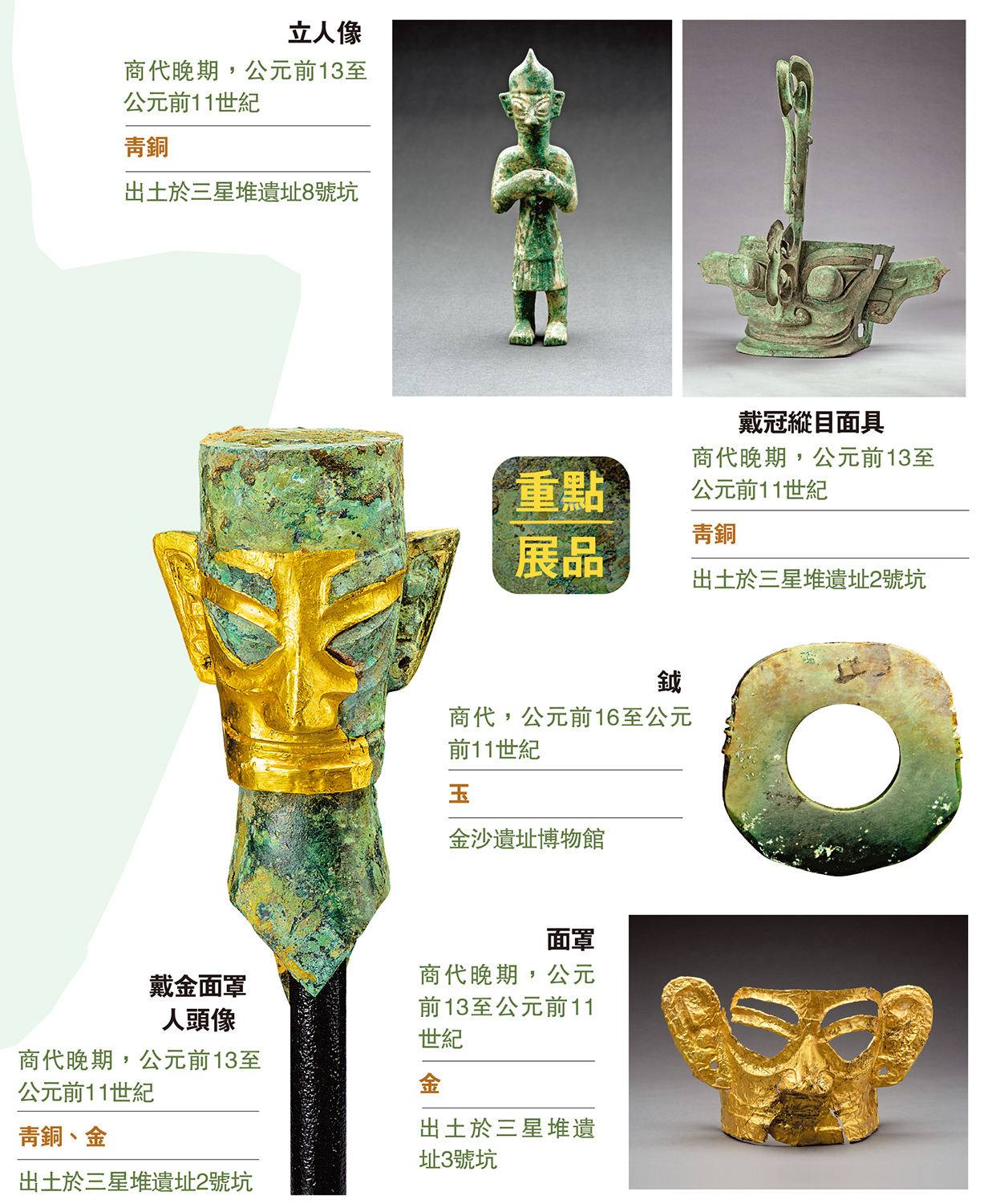 「凝視三星堆」展覽將聚焦以三星堆遺址為代表的四川地區考古新發現,其中接近一半展品為2020至2022年間三星堆遺址最新發掘的重要出土文物,大部分更是首次在四川省外展出。重點展品包括三星堆遺址出土、距今3000至3200年的各類青銅面具、青銅人像和黃金面具等。金沙遺址博物館亦提供數件從未在外展出過的珍貴文物,當中包括距今3000多年的玉鉞等。