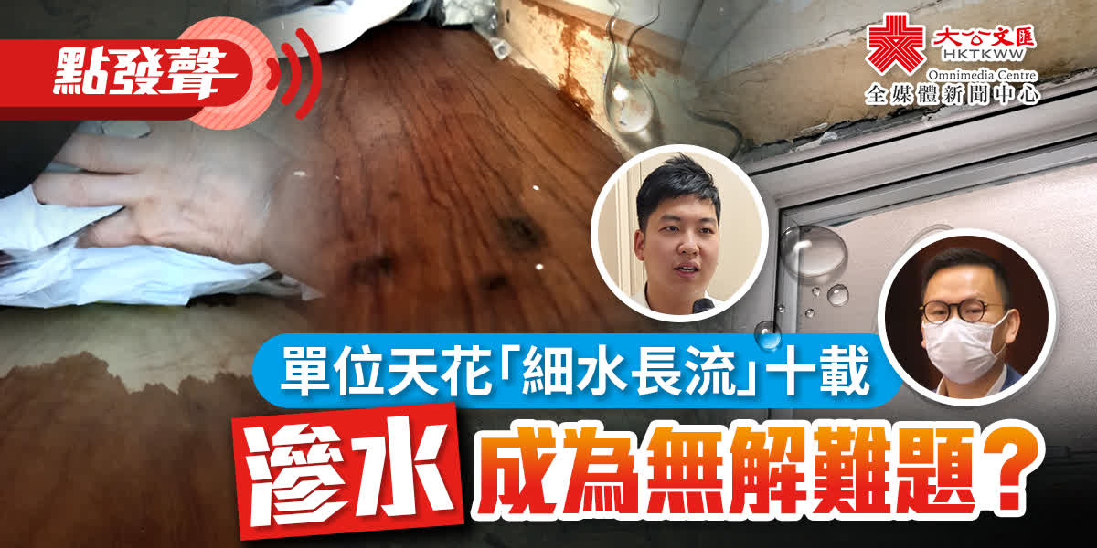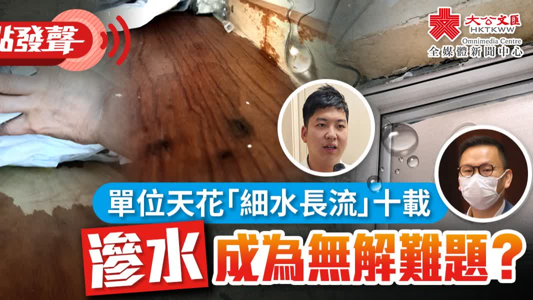 據點新聞報道:大廈單位滲水問題時常發生,成為業主或住戶之間的一大難題,權責問題加上時間難以配合,往往引致鄰居出現糾紛,日前黃埔花園滲水個案甚至有人因滲水問題而自殺。點新聞近日收到一名讀者投訴,指2012年搬入居所後,長期受樓上滲水問題所困擾,她雖然向部門反映,可是十年來問題一直未有解決。難道,滲水問題真的無法解決?