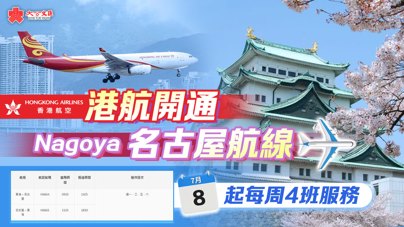 大公文匯全媒體報道:香港航空今日(23日)宣布,為持續拓展日本市場業務,將於今年7月8日起開通每周四班連接香港和名古屋的服務。