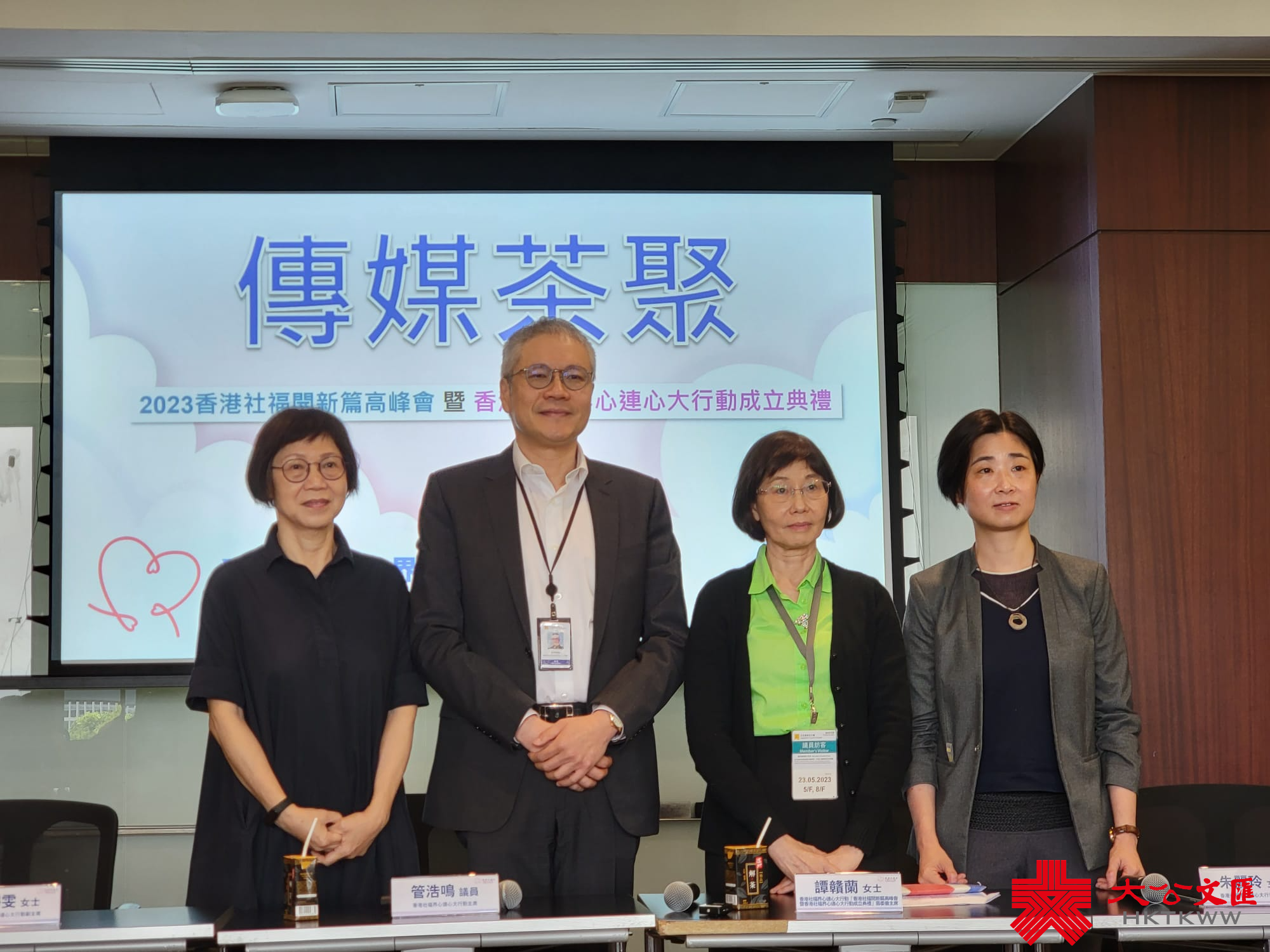 大公文匯全媒體記者馮沛賢報道,「2023香港社福開新篇高峰會暨香港社福界心連心大行動」(「大行動」)成立典禮將於5月29日舉行。「大行動」主席管浩鳴議員、副主席林靜雯、秘書長朱麗玲及典禮籌委會主席譚贛蘭今日(23日)於立法會舉行傳媒茶聚。管浩鳴表示,特首李家超及勞服局局長孫玉菡、社會福利署署長李佩詩等多名政府官員將到場,更有廣東省民政部門官員出席,預計現場有400、500名社服界同工參與,線上線下參與者將超過2萬人。