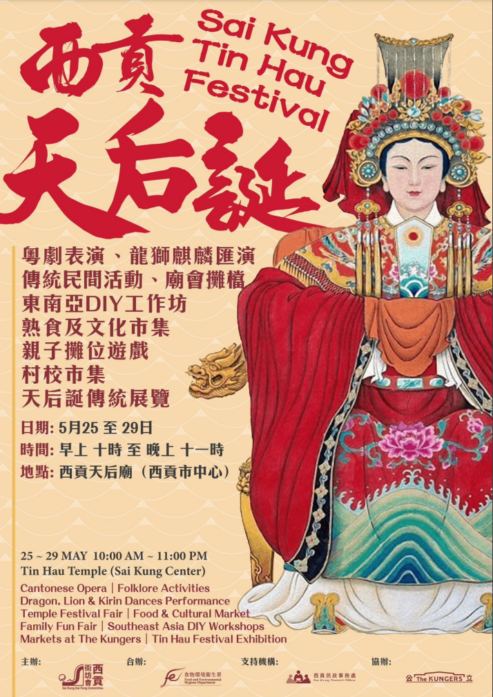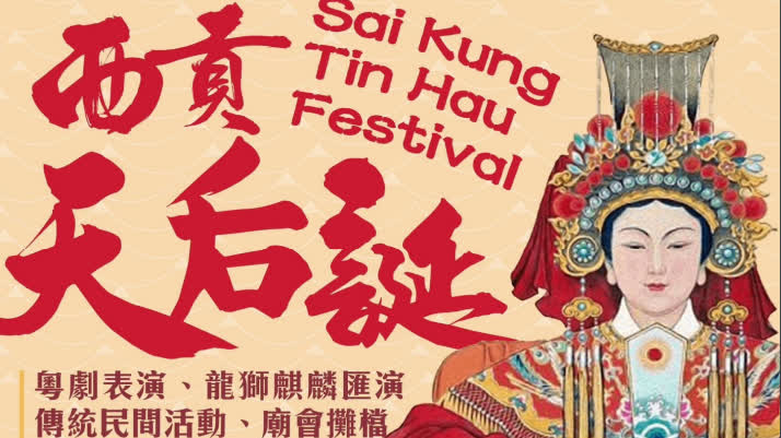 「西貢天后誕」將於5月25日至29日假西貢天后廟舉辦,屆時將有粵劇表演、龍獅麒麟匯演、傳統民間活動、天后誕傳統展覽、熟食及文化市集等,現場設66個攤檔,包括廟會攤檔、東南亞DIY工作坊、親子攤位遊戲。