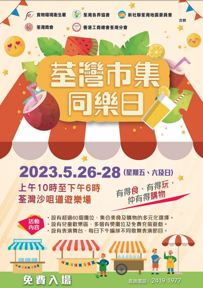 「荃灣市集同樂日」則會於5月26日至28日在荃灣沙咀道遊樂場舉行,設有超過60個攤位,集合美食及購物的多元化選擇,並設有兒童歡樂區及多個有獎攤位及免費充氣遊戲。同樂日亦設有表演舞台,每日下午將編排不同歌舞表演節目。