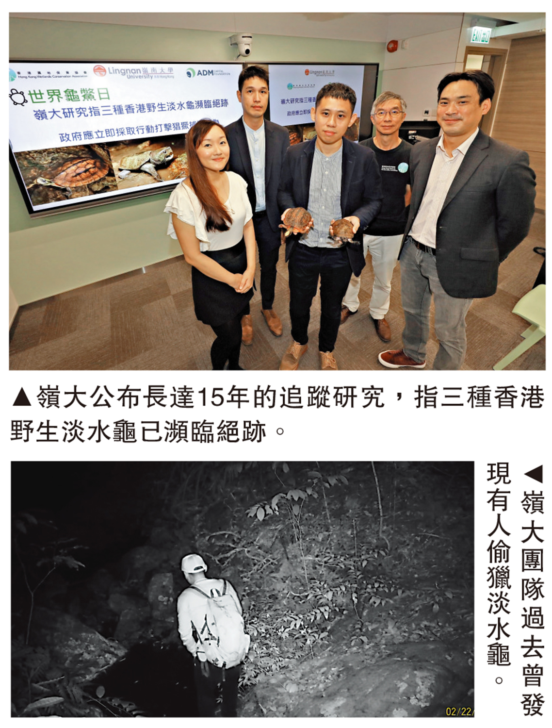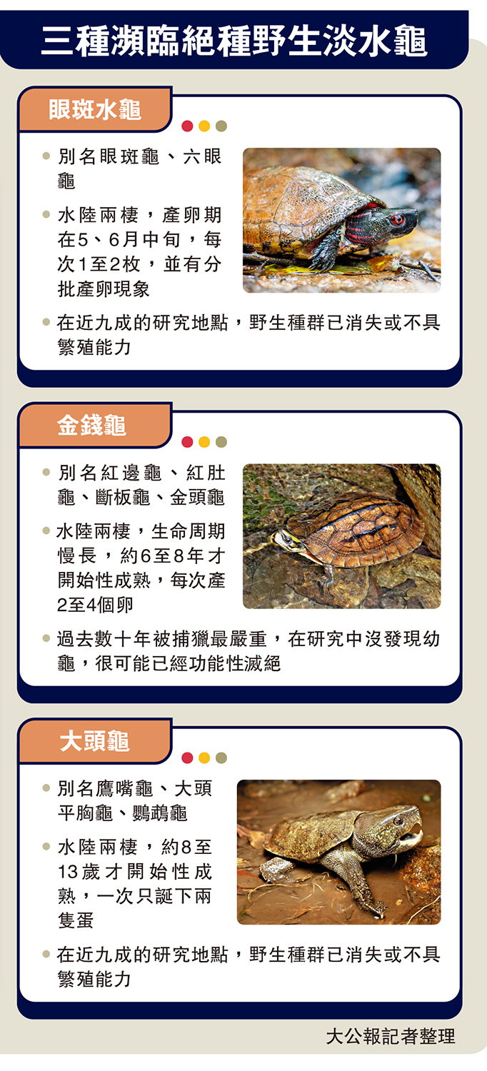 昨日是「世界龜鱉日」,嶺大科學教研組表示,香港是數種全球受威脅淡水龜物種的最後重要據點,包括兩種極危物種金錢龜和大頭龜,以及瀕危物種眼斑水龜。不過,團隊過去15年在香港約100個地點,包括郊野公園、河流溪澗等野生淡水龜出沒的生境,進行分布調查和族群監測,發現近九成的研究地點,大頭龜和眼斑水龜的野生種群已消失,或因成體少於兩隻而不具繁殖能力,只剩零星殘存種群。