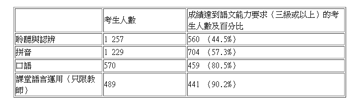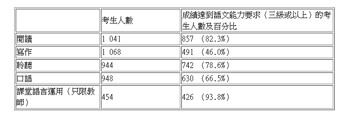 本年度共有1475名考生參加英國語文科評核,1810名考生參加普通話科評核。評核結果如下: