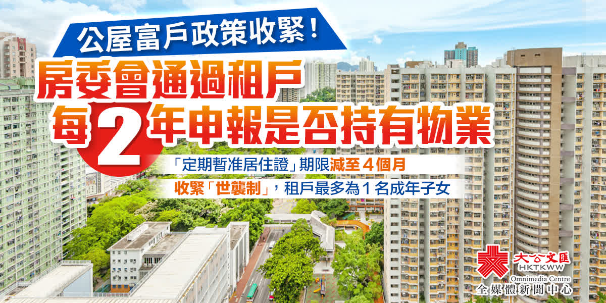 此外,房委會亦通過縮短「定期暫准居住證」期限,由現時1年減至4個月,限期過後必須遷出;「世襲制」同樣收緊,只容許租戶為最多1名成年子女加戶,若戶籍內已有成年子女,就不得再額外加戶。