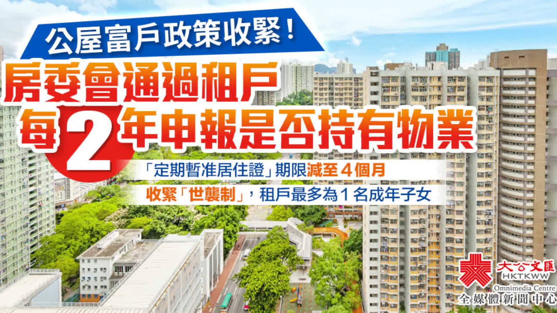 大公文匯全媒體報道,房屋委員會本月初與轄下的資助房屋小組舉行集思會,商討收緊公屋富戶政策。房委會資助房屋小組今日(24日)通過收緊公屋租戶的申報機制,公屋租戶由現時住滿10年須首次申報,大幅「加辣」至每2年申報居住狀況,包括是否持有本地物業等。此外,租戶須在本地置業後的1個月內申報。
