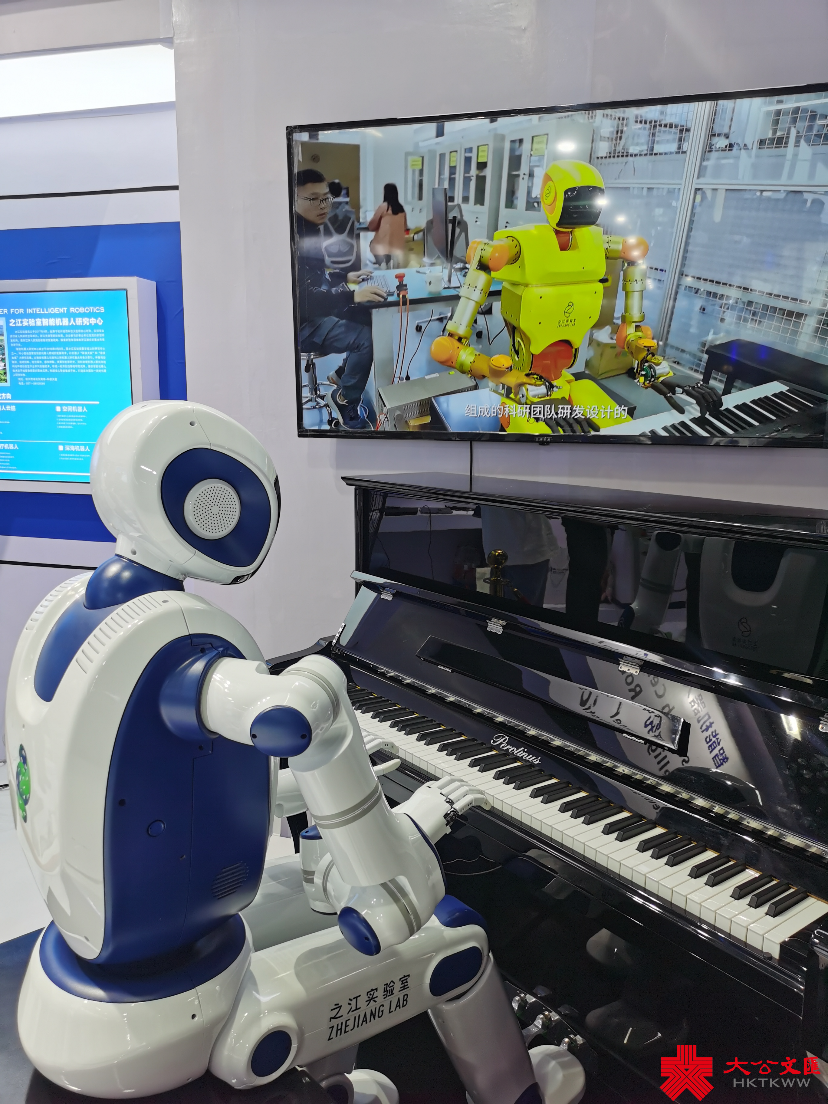 記者來到機械人峰會展示現場,各種工業機械人在現場演示,機器狗、外骨骼機械人、仿生機械人、按摩理療機械人等各種類型機械人吸引目光。來自之江實驗室的人形機械人「曉樂」正在彈奏《卡農》鋼琴曲,之江實驗室智能機械人研究中心副主任宋偉說,「曉樂」現在升級到第三代,這次帶她來參展,是想尋求技術合作。大家可以在她身邊的平板上點歌,目前她已經學會了30多首名曲。這款彈鋼琴機械人,集成了我們在靈巧手、多關節融於機械臂這方面的技術,通過頭部的視覺來去定位琴鍵的位置,實現高精度、高速度的演奏。」