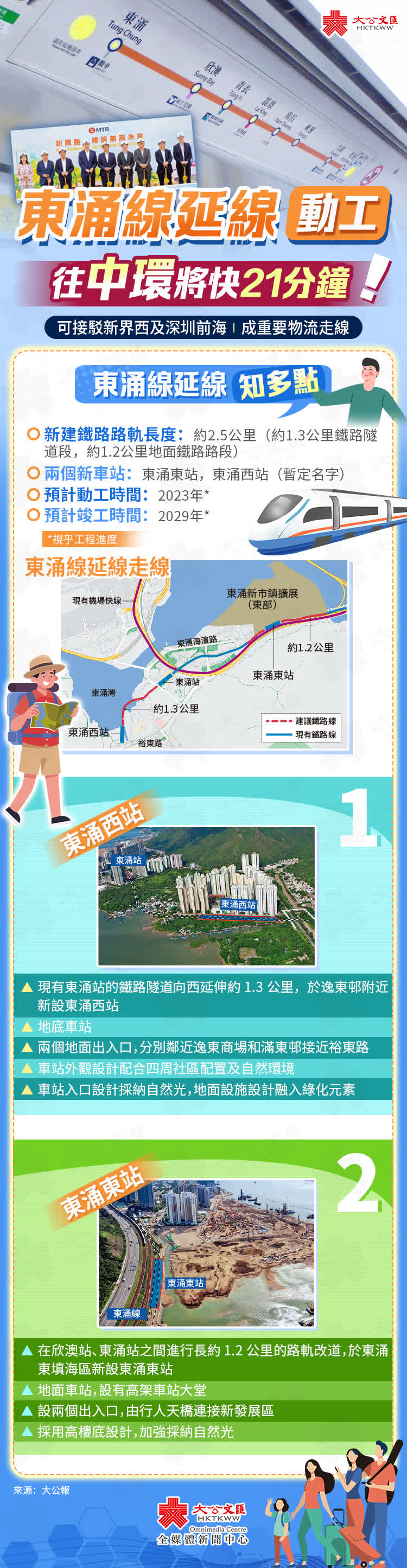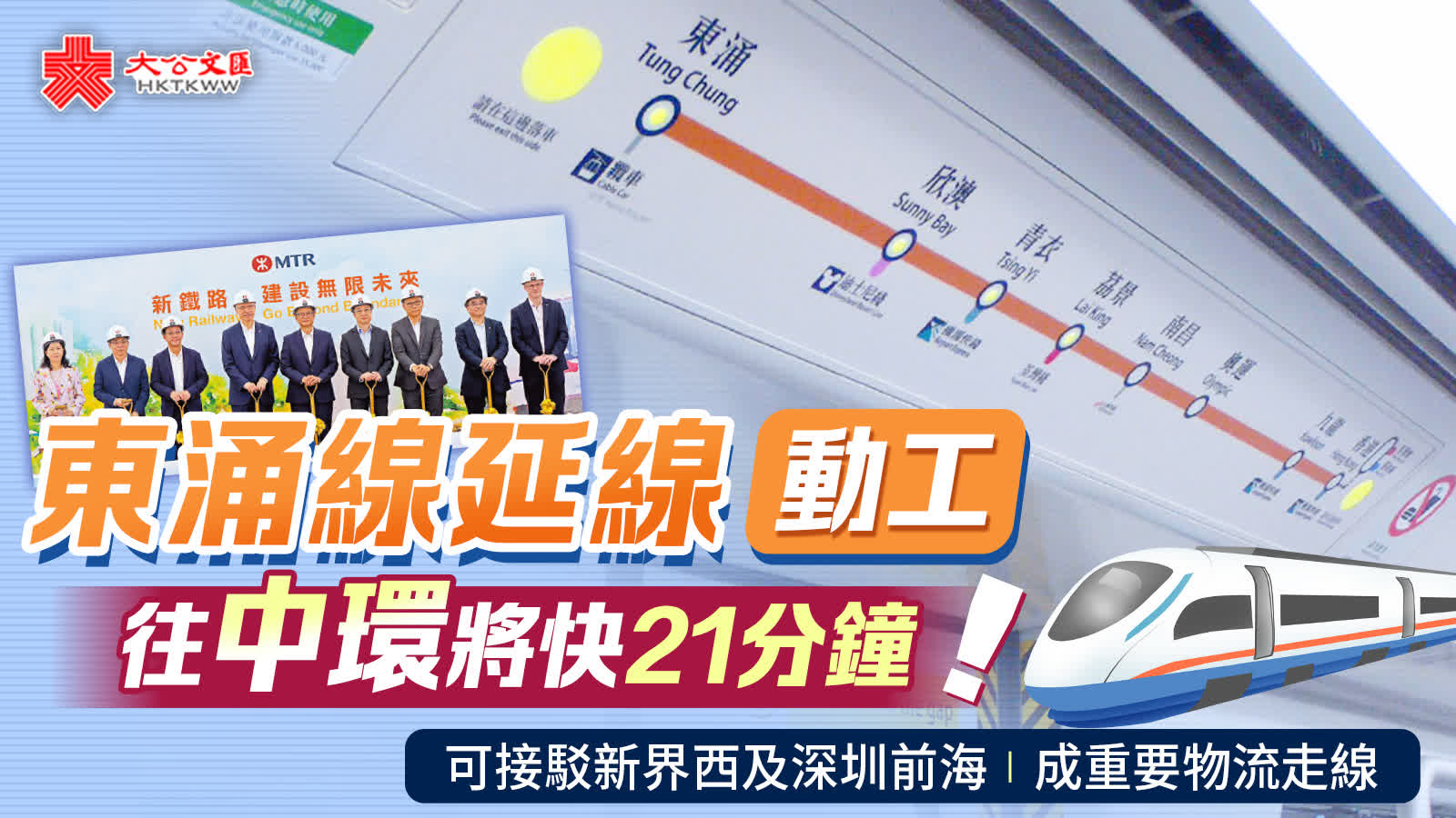 (大公報記者 易曉彤)港鐵新一批新鐵路項目首個項目動工,東涌線延線昨日舉行動工禮,在現時的東涌線新增東涌東、東涌西兩個車站,預計於2029年竣工,服務區內29萬人口。財政司司長陳茂波表示,東涌延線落成後,市民由東涌東往中環或尖沙咀,車程可縮短21分鐘。東涌鐵路將來可接駁新界西以至深圳前海,構成運輸物流走線,對本港物流業有很大幫助。