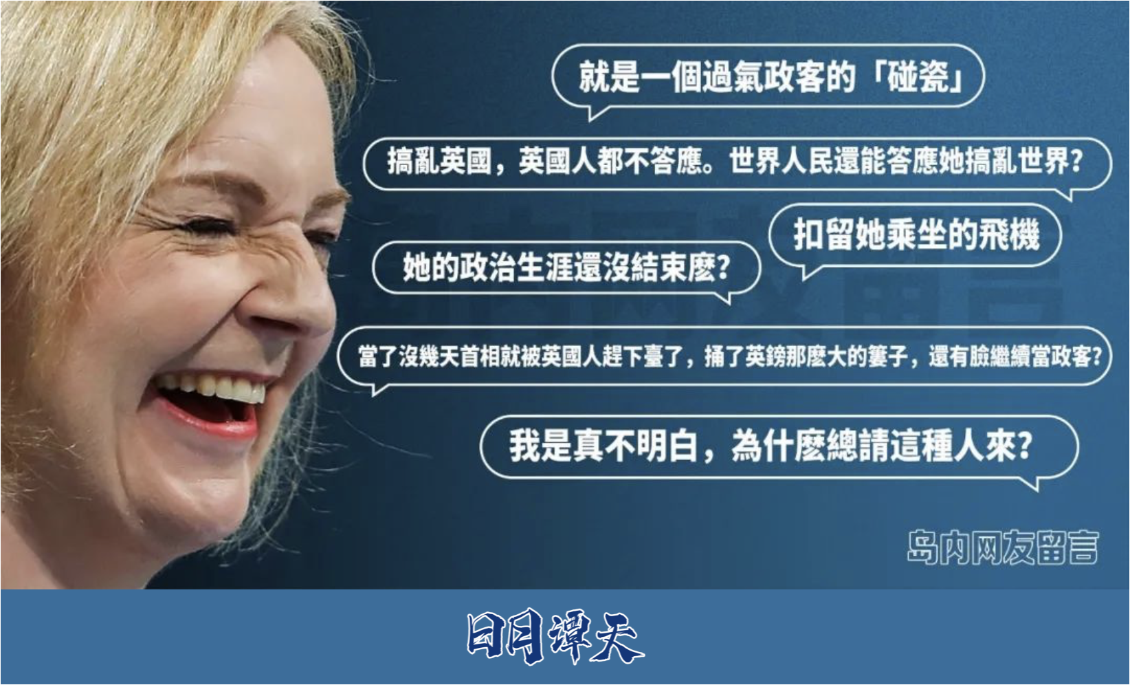 譚主檢索了與特拉斯竄台相關的島內媒體報道,發現一個很有代表性的質問:「對於這麼一個失敗、短命、在政壇喪失影響力的前首相,你們還在天真地認為她竄台對台灣有好處嗎?」