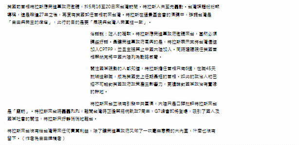 近日,台灣中時新聞網刊發了一篇快評文章:《特拉斯悄悄走了》。文章說到:特拉斯來台沒有給台灣帶來任何實質利益,除了讓民進黨當局又做了一次毫無意義的大內宣,什麼也沒有留下。