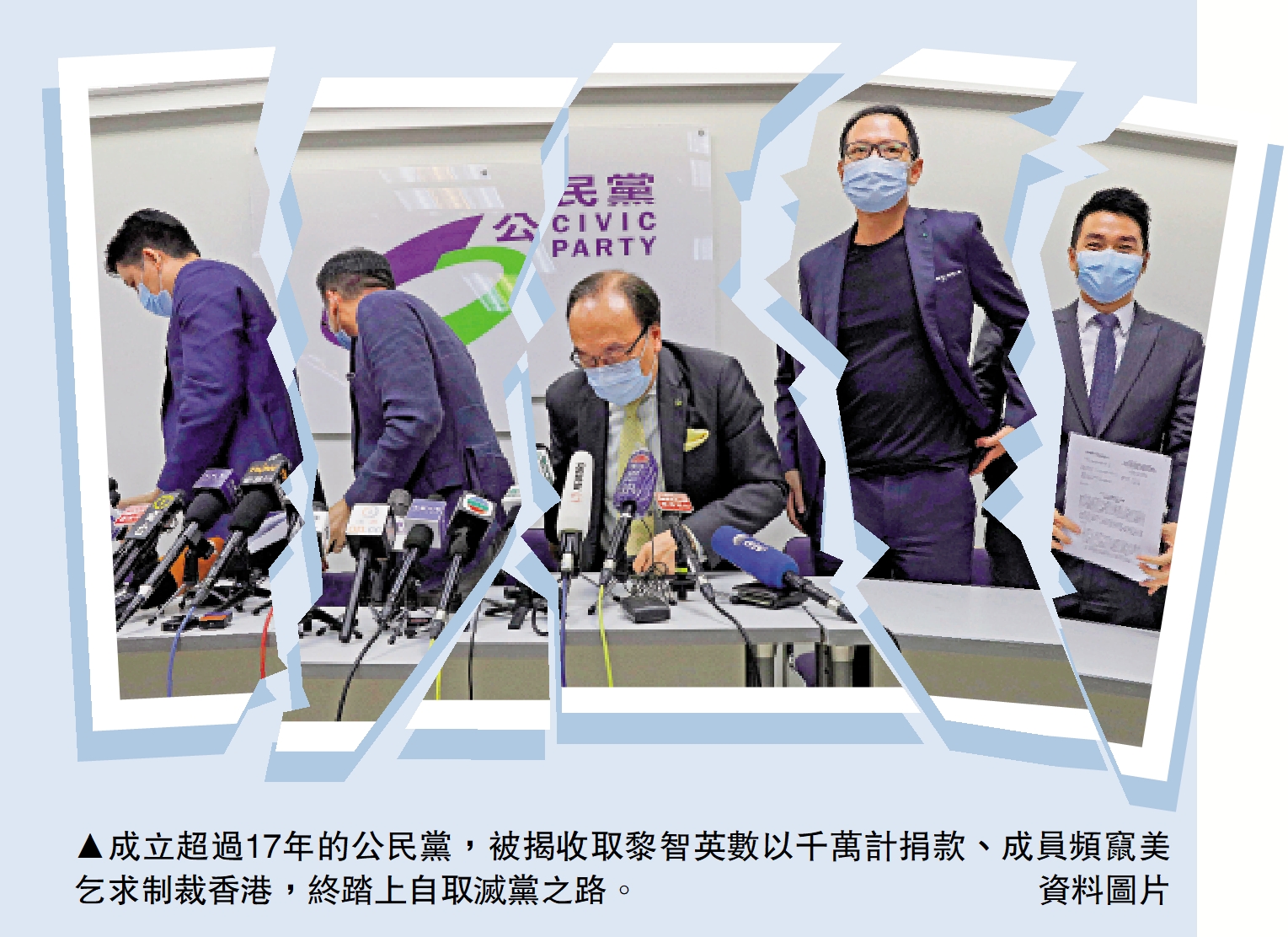 成立超過17年的公民黨,於2006年成立,曾經是香港反對派的第二大政黨。自成立後,該黨以其所謂法律「專業」,煽惑並鼓吹市民不擇手段去爭取各項不符基本法規定的所謂「訴求」,衝擊「一國兩制」原則。由2014年推動非法「佔中」,2016年旺角暴亂,到2019年修例風波期間,該黨都不斷合理化暴力,公然為暴徒撐腰,後期甚至以立法會議員身份到美國,乞求美國政府制裁香港。
