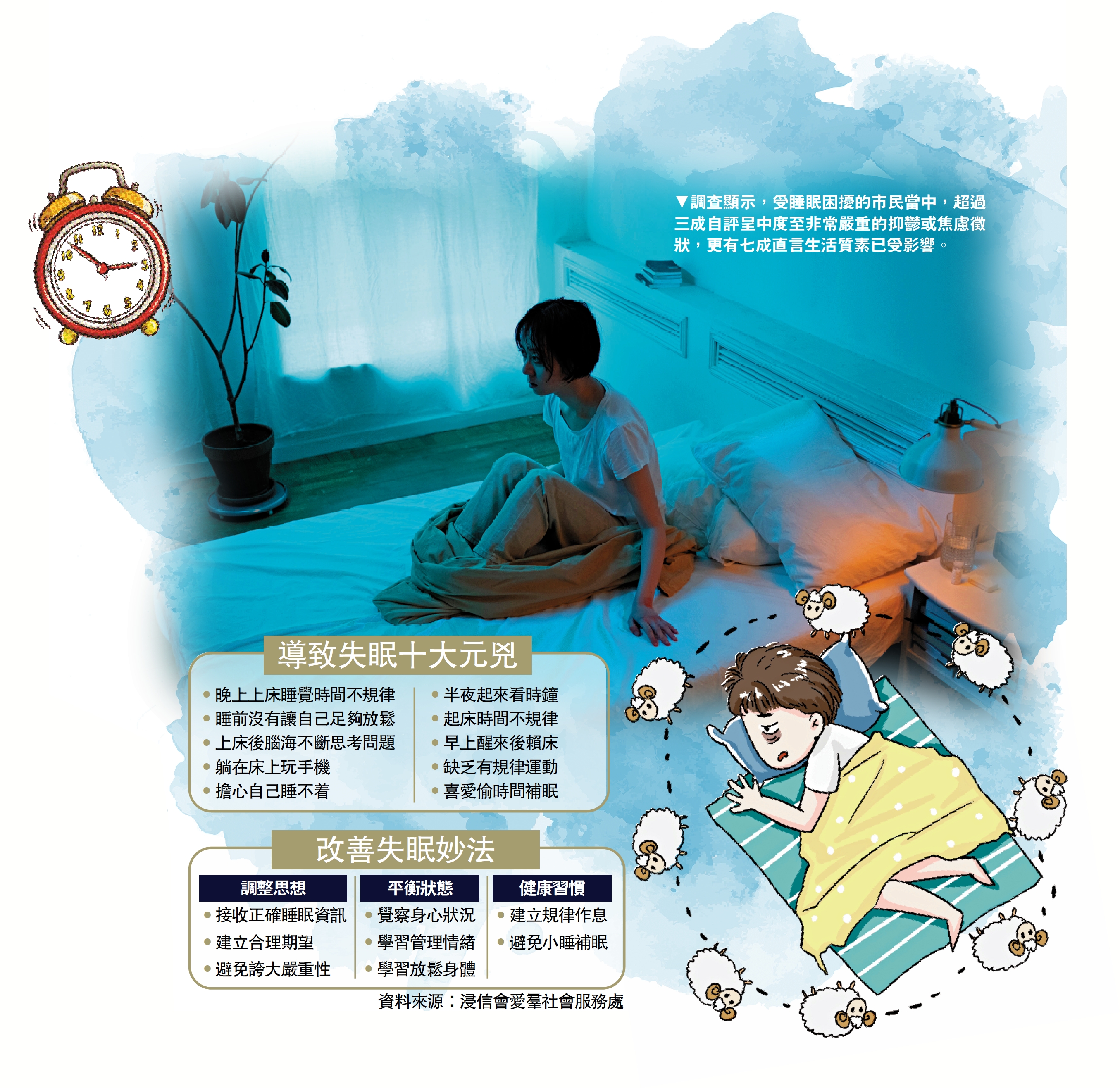 為了解失眠對市民情緒健康的影響,浸信會愛羣社會服務處聯同香港教育大學,於2022年4月至今年3月期間收集港人情緒及睡眠質素情況,其中一項研究以線上問卷形式訪問358位受輕度至中度睡眠困擾的市民,結果三成受訪者自評呈中度至非常嚴重的抑鬱或焦慮徵狀,更有七成指已影響生活質素,難以應付工作、家庭、休閒娛樂或與人際關係等方面。