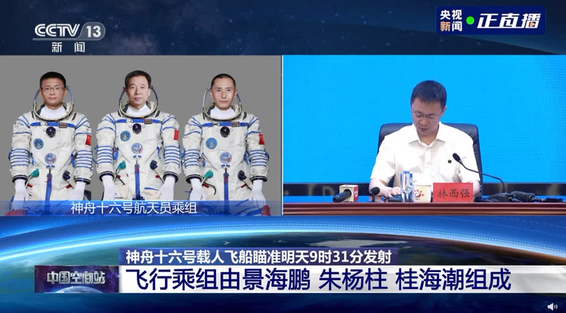 據央視新聞報道,經空間站應用與發展階段飛行任務總指揮部研究決定,神十六瞄準明日9時31分發射。神舟十六號飛行乘組由航天員景海鵬、朱楊柱和桂海潮組成,景海鵬擔任指令長。
