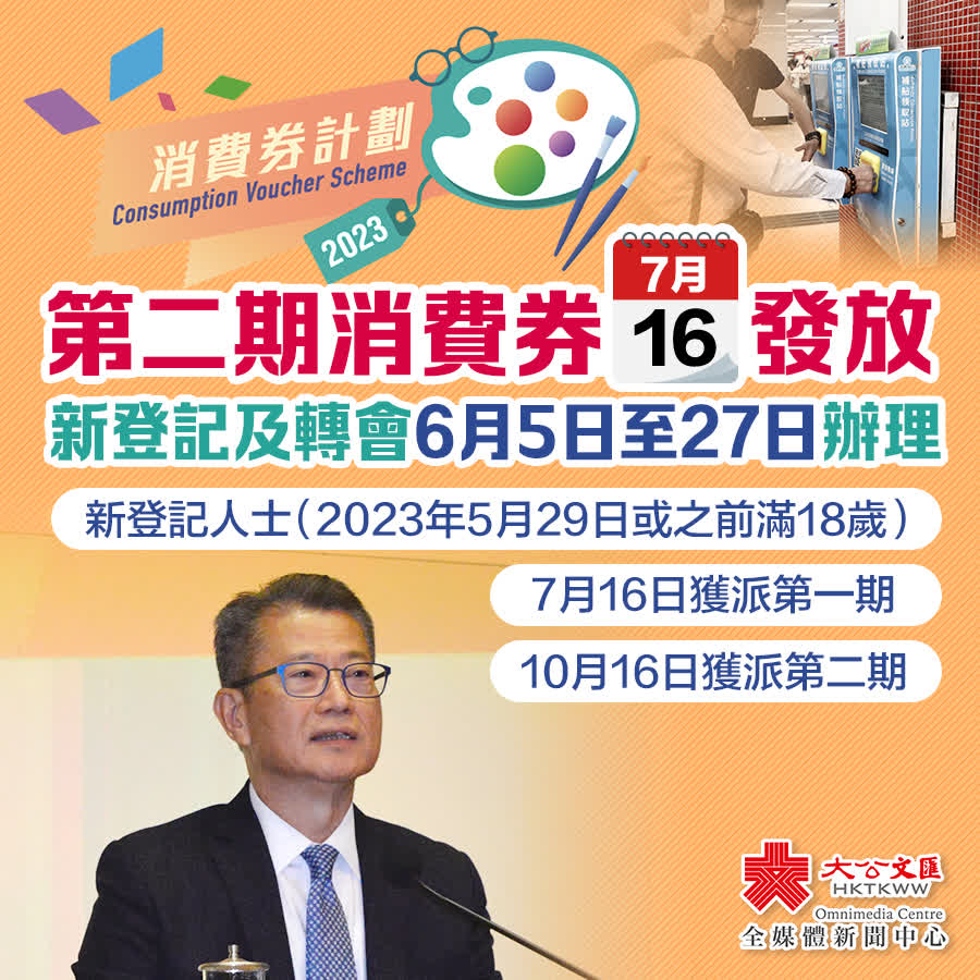 大公文匯全媒體報道,財政司司長陳茂波今日(29日)下午舉行記者會,公布2023年第二期消費券計劃的詳情。陳茂波表示,第二期消費券將在7月16日發放,6月5日至27日接受登記,預料會向市場注入130億元消費力。