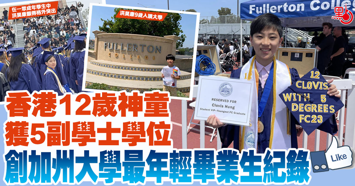 大公文匯全媒體報道,近期美國加州出現一名年僅12歲的神童「大學畢業生」。他是在香港出生的男童洪昊康(Clovis Hung),從9歲起就進入加州佛勒頓專科學院(Fullerton College)就讀,最近成功獲得5個副學士學位,創下該校最年輕畢業生的紀錄。