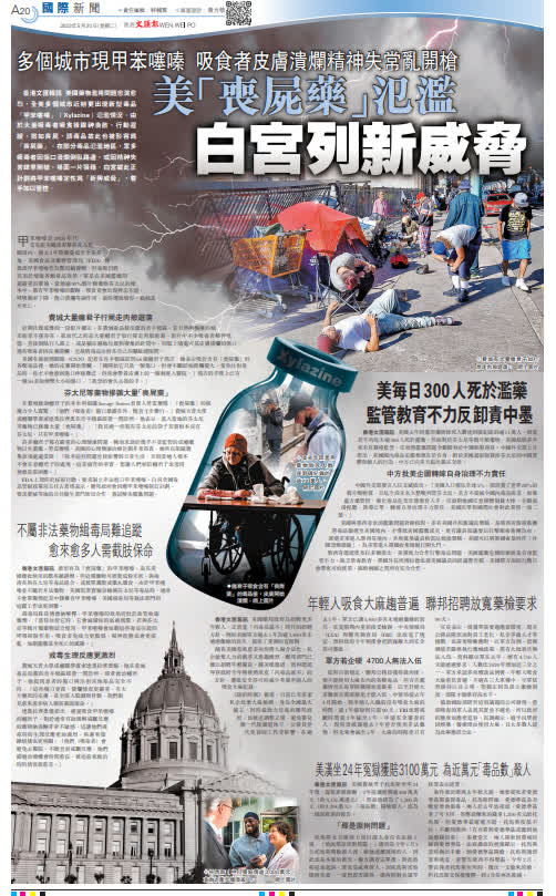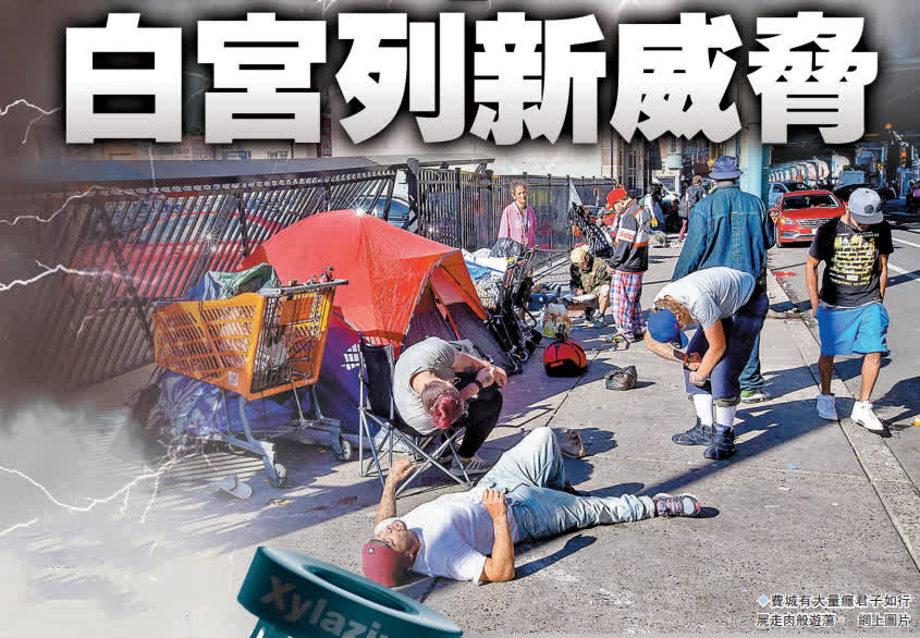 香港文匯報報道:美國藥物濫用問題愈演愈烈,全美多個城市近期更出現新型毒品「甲苯噻嗪」(Xylazine)氾濫情況。由於大量吸毒者吸食後眼神渙散、行動遲緩,猶如喪屍,該毒品故此也被形容為「喪屍藥」。在部分毒品氾濫地區,眾多吸毒者因傷口潰爛倒臥路邊,或因精神失常肆意開槍,場面一片狼藉。白宮據此正計劃將甲苯噻嗪定性為「新興威脅」,着手加以管控。