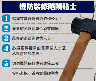 香港測量師學會提醒,市民在處理住宅裝修前,應選擇有良好聲譽的裝修公司,並盡量避免改動單位原有間隔,倘若無可避免改動間隔,應先諮詢專業人士。