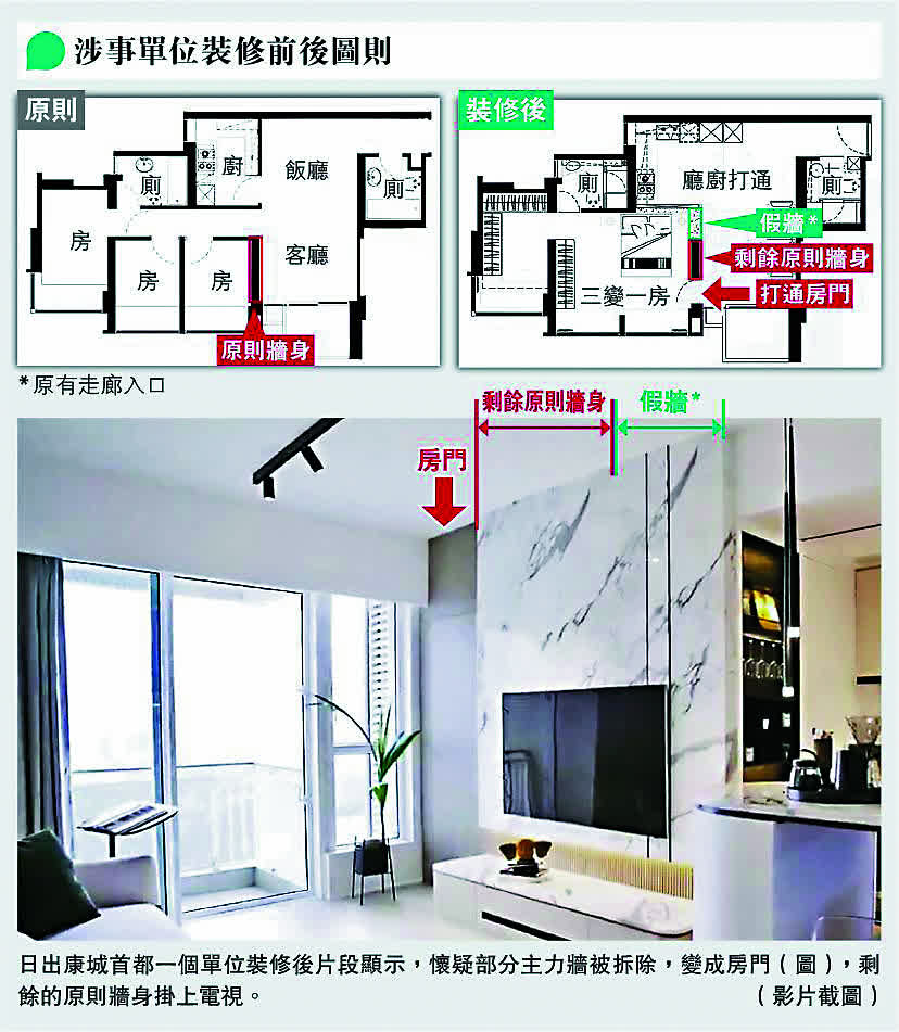 屋宇署署長余寶美昨日會見傳媒時表示,署方高度關注日出康城首都一單位的部分結構牆被拆去的事件,前日與單位業主、負責裝修的設計公司負責人,以及物業管理職員到場視察。對於最初負責該單位裝修的設計師,該署將跟進其曾參與的工程,並請對方接受進一步調查。她表示,違規情況發生在個別單位內部,署方做不到逐個單位入內查找,只能靠市民舉報,未來希望加強公眾教育,裝修前一定請專業人士評估,並向屋宇署提出申請。
