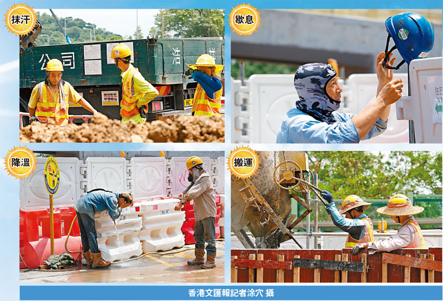 (香港文匯報 記者 郭倩)熱帶氣旋「瑪娃」正往台灣地區海域緩慢向偏北方移動,受其外圍下沉氣流影響,華南沿岸地區天氣持續酷熱。香港天文台昨晨首次發出「極端酷熱天氣」特別提示,上水、屯門、沙田等多地於中午時分氣溫高達35度或以上,上水石湖墟球場氣溫更一度高見41度,加上空氣質素造成的健康風險達「嚴重」水平,又熱又焗。有市民大呼:「好似焗桑拿!」惡劣天氣及高污染空氣環境之下,部分紮鐵、搬運工人頂住烈日繼續工作,不少地盤工人表示,僱主未理會勞工處的防中暑指引安排他們休息及消暑,「休息時間與平時無差別。」