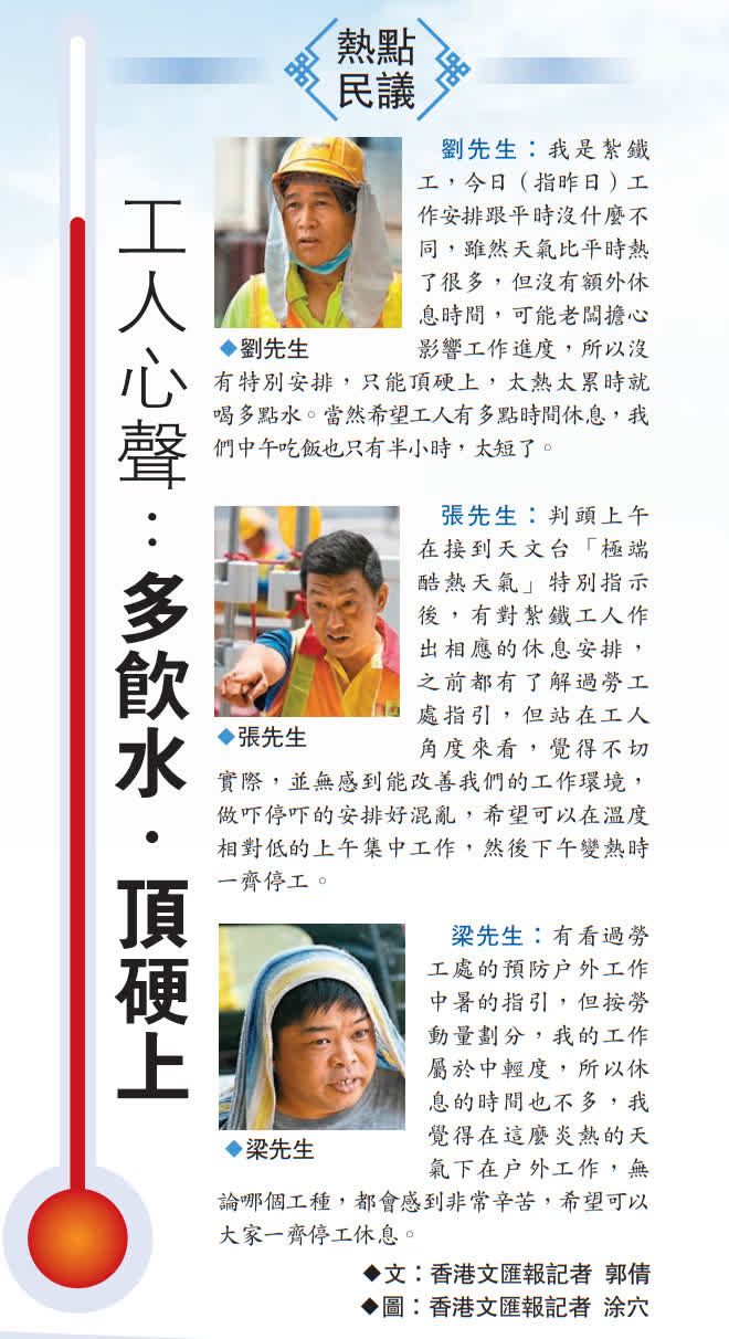 在一個政府鋪路工程工作的紮鐵工人張先生則表示,在天文台發布「極端酷熱天氣」特別提示後,判頭下午有按照勞工處的指引安排工人休息,惟該指引未能讓他滿意,「明白勞工處是出於體諒工人而設立這個指引,但作為工地工人的我並不覺得實行了能改善我的工作環境。」