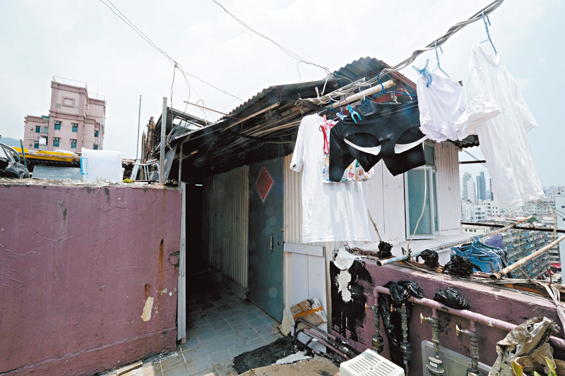 天台屋住戶除了忍耐酷熱,還要面對打風的苦況。林女士與丈夫居於太子一間天台屋多年,丈夫較為年長,體弱多病不便行走,林女士為照顧丈夫難以外出工作,「之前有些許積蓄,但疫情期間用得七七八八,丈夫有生果金,我偶然出去做下散工。」