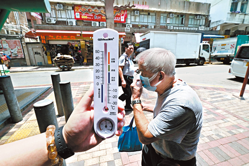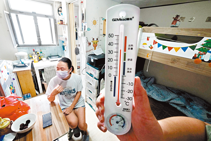 (香港文匯報記者 廣濟)受颱風「瑪娃」的外圍下沉氣流影響,香港天文台昨日連續第二天發出「極端酷熱天氣」提示,並料未來兩三日持續酷熱。天台屋及劏房由於地方狹窄、通風欠佳,加上烈日直曬,居民如同住在烤爐中,當中不少人為慳電費,不捨得開冷氣。香港文匯報記者昨日到其中一個天台屋實測,室內溫度高見攝氏34度至35度,住戶說:「不斷喝冷飲,甚至吃冰塊都無法降溫。」唯有白天流連冷氣開放的商場,甚至蹭鄰居的冷氣。