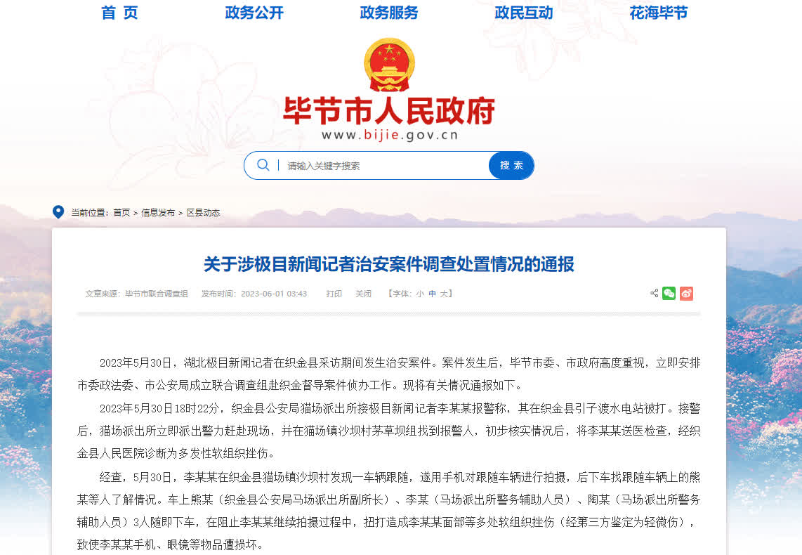 2023年5月30日,湖北極目新聞記者在織金縣採訪期間發生治安案件。案件發生後,畢節市委、市政府高度重視,立即安排市委政法委、市公安局成立聯合調查組赴織金督導案件偵辦工作。現將有關情況通報如下。