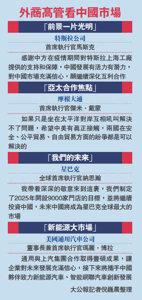 (大公報記者 倪巍晨 上海報道)特斯拉首席執行官馬斯克訪華的消息連日來刷屏,跨國公司高管「訪華潮」持續升溫。近期訪華的美企高管絕非少數,摩根大通集團董事長兼首席執行官傑米·戴蒙、輝瑞董事長兼首席執行官艾伯樂、星巴克全球首席執行官納思瀚等現身上海,希望更直觀地了解中國最新的經濟和政策,以更好制定合理投資決策。跨國企業高管密集訪華的背後,是中國對外開放的魅力,他們也用實際行動對中國經濟投出「信任票」。