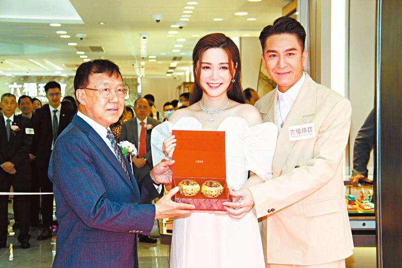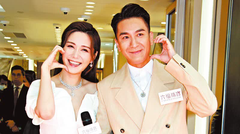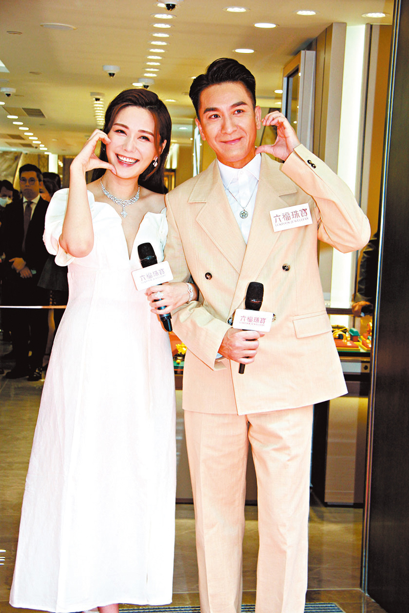 (香港文匯報記者 達里)準夫妻馬國明與湯洛雯(靚湯)昨日替珠寶店新店擔任開幕嘉賓,穿上淺色低胸裙的靚湯,與西裝骨骨的馬國明如預演婚禮一樣,靚湯不時大晒手上鑽戒,又擺出可愛心心甫士,與馬國明皆流露幸福笑容,二人更獲珠寶店送贈一對龍鳳鈪作賀禮。