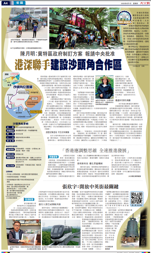 沙頭角應如何開放?陳月明指《大公報》報道中提到的包括「港進港出」、「深進深出」、深港共同打造國際消費合作區,相關建議結合高質量及北都發展的元素均是切實可行。陳月明指「香港與深圳情如兄弟,兩地發展,尤其北部都會區的發展,是互利互惠互補,不應該存在誰規劃誰的誤會,兩地發展目標一致,自然就會友好協商及溝通!」她指出,今時今日的香港,已經走出由亂及治、正在全速走入由治及興,社會各方也不會再接納違背發展建設的聲音,所以毋須擔憂走港深合作的路線。