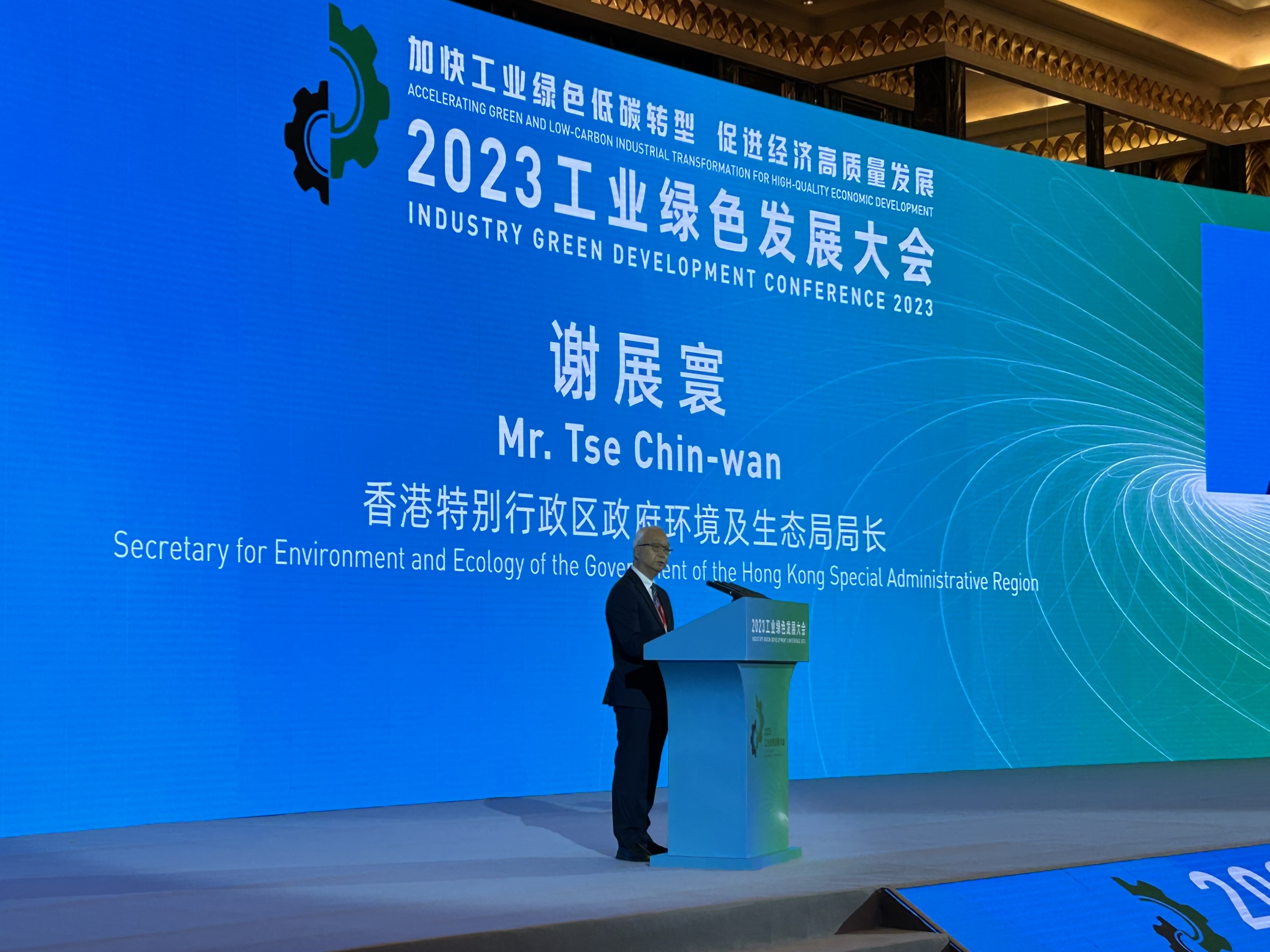 2023工業綠色發展大會由國家工業和信息化部、廣東省人民政府,以及廣州市人民政府共同主辦,主題為「加快工業綠色低碳轉型 促進經濟高質量發展」。謝展寰在主旨發言時表示,為配合國家的「雙碳」目標,特區政府在2021發表《香港氣候行動藍圖2050》,訂下「淨零發電」、「節能綠建」、「綠色運輸」和「全民減廢」四大減碳策略,爭取在2035年前將碳排放總量從2005年的水平減半,並邁向2050年前達致碳中和的目標。