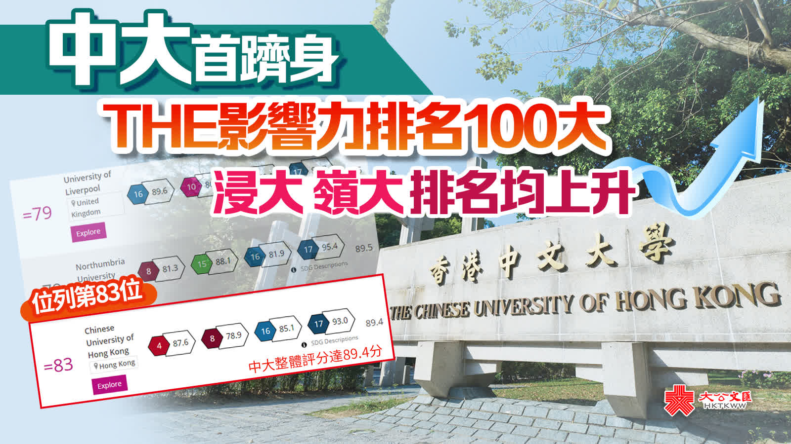 大公文匯全媒體報道,2023年度泰晤士高等教育(Times Higher Education,THE)世界大學影響力排名昨日(6月1日)公布,本港3間大學排名上升,排名最高的香港中文大學今年更是首次打入全球百大,位列第83位。