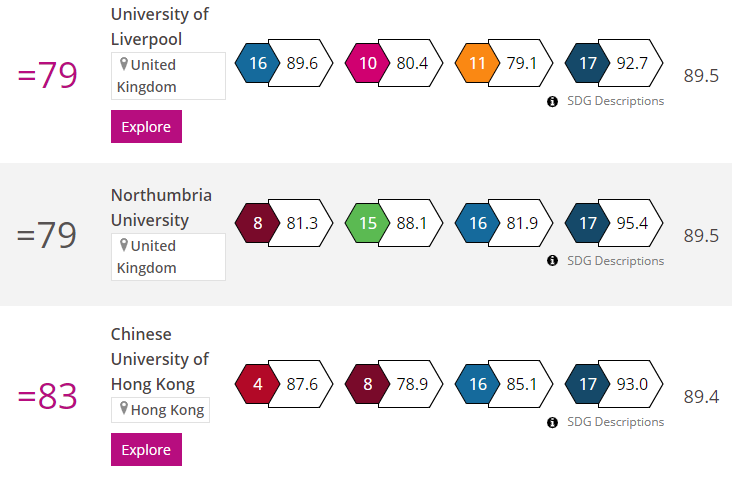 香港方面,中大由去年排名101至200位,升至今年的第83位,整體評分達89.4分,再次成為本港排名最高的大學。中大在優質教育(SDG 4)、體面工作和經濟增長(SDG 8)及和平、正義與強大機構(SDG 16)方面表現較佳,分別位列全球第5位、第22位和第23位。嶺南大學亦由去年第201至300位,上升至今年101至200位;浸會大學則由去年第401至600位,上升至今年201至300位。